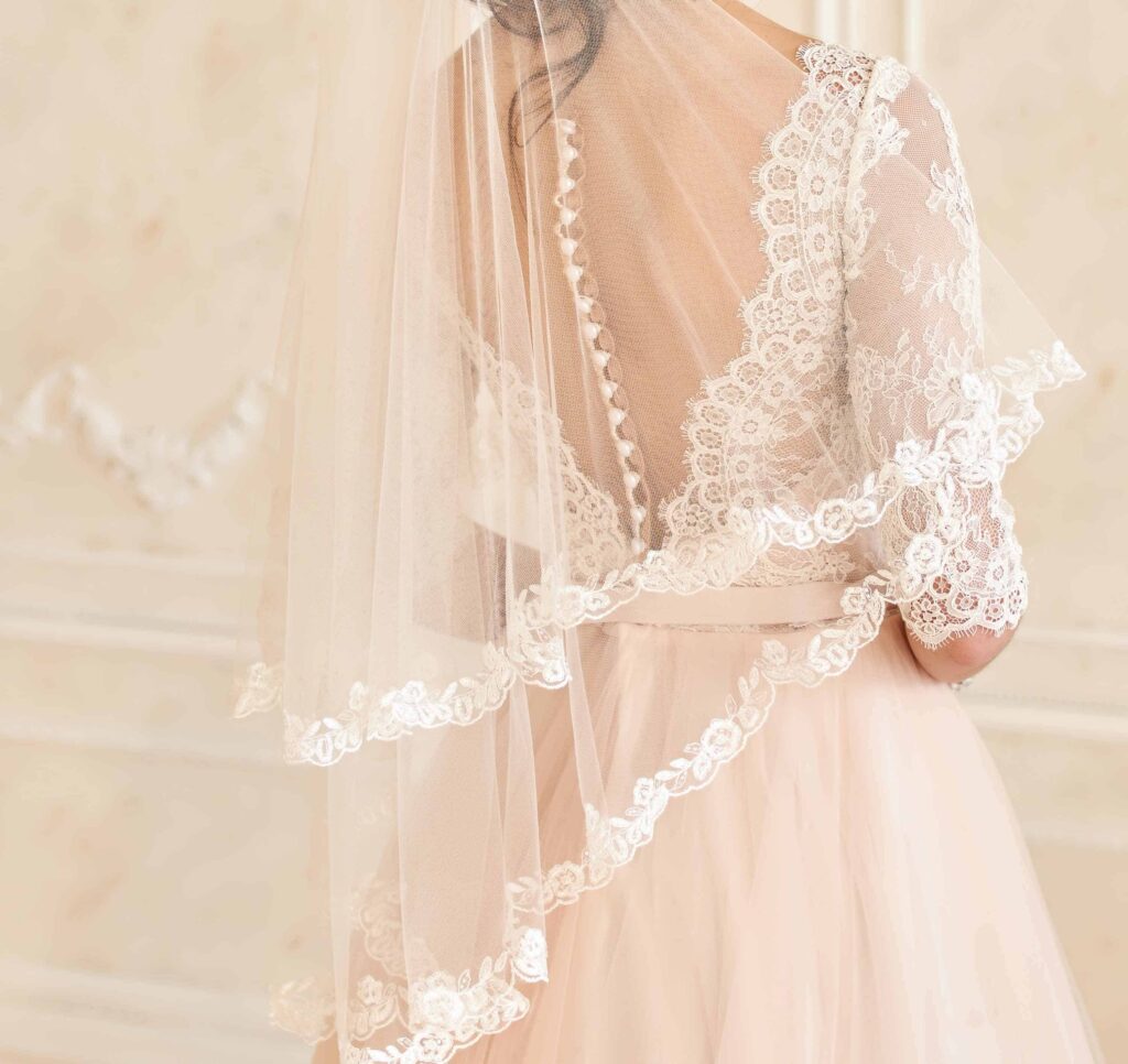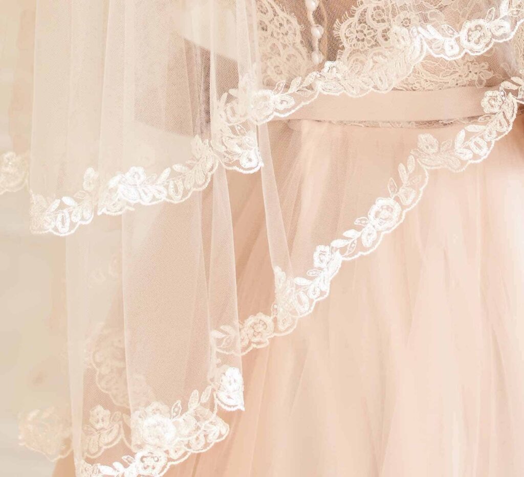 Voal de lungime medie , 2 m lungime din care 50 cm sunt partea dubla ce poate fi data pe fata ,acest voal este din tull cu terminatie brodata plina de aplicatii din margele tubulare transparente si pieptan montat ce se prinde in par .