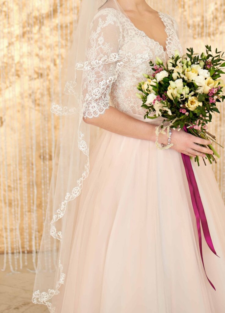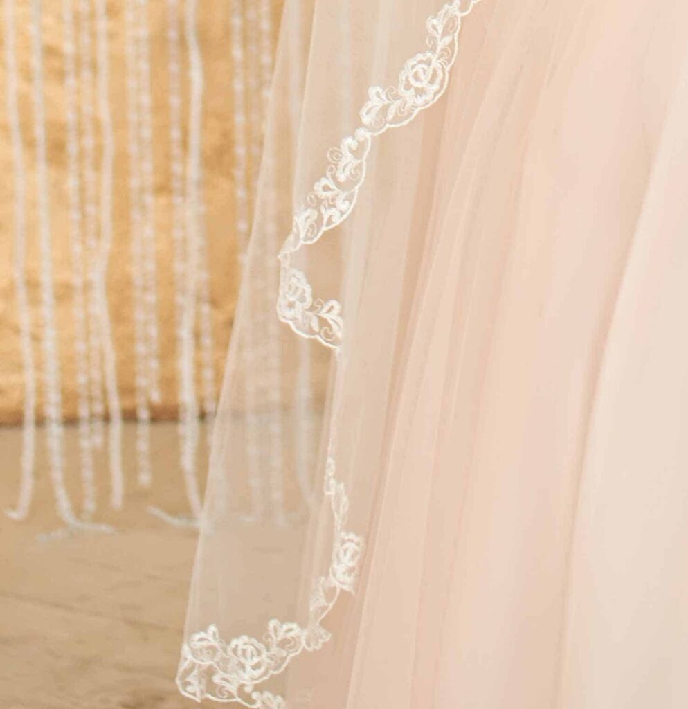 Voal de lungime medie 2 m lungime din care 50 cm sunt partea dubla ce poate fi data pe fata ,acest voal este din tull cu terminatie brodata plina de aplicatii din margele tubulare transparente si pieptan montat ce se prinde in par .