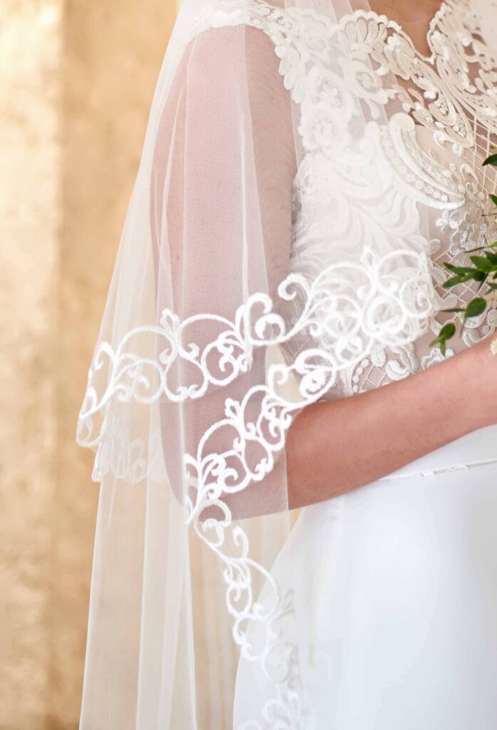 Vera Sposa » Accesorii Mireasă » Voaluri » VL-27VL-27ACCESORII MIREASăVoal de lungime medie 2 m lungime din care 50 cm sunt partea dubla ce poate fi data pe fata ,acest voal este din tull cu terminatie brodata si pieptan montat ce se prinde in par COD PRODUS VS-0026-7355