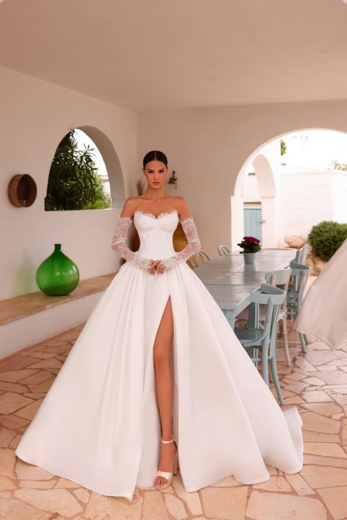 Modelul prințesă combină un corset structurat cu o fustă amplă, adesea realizată din mai multe straturi de tulle sau satin. Este o alegere potrivită pentru nunți formale sau ceremonii religioase tradiționale.