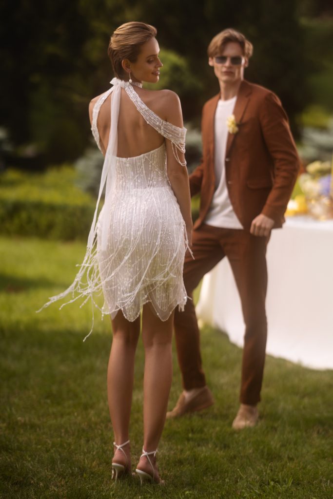 Rochia poate fi purtată cu pantofi cu toc subtire și o coafură romantică, astfel încât accesoriul de la gât să iasă în evidență și să completeze perfect ținuta miresei.