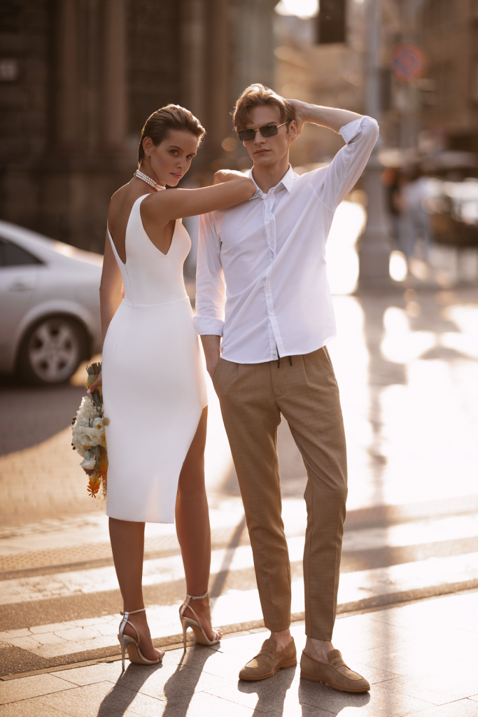 Accesorizată cu bijuterii delicate și un buchet de flori proaspete, această rochie va atrage cu siguranță atenția tuturor celor prezenți la eveniment. Rochia de cununie midi clasica, eleganta, cu corset plin, decolteu adânc și spate în formă de V, fusta dublă, scurtă și petrecută, este alegerea perfectă pentru o mireasă clasică și sofisticată.