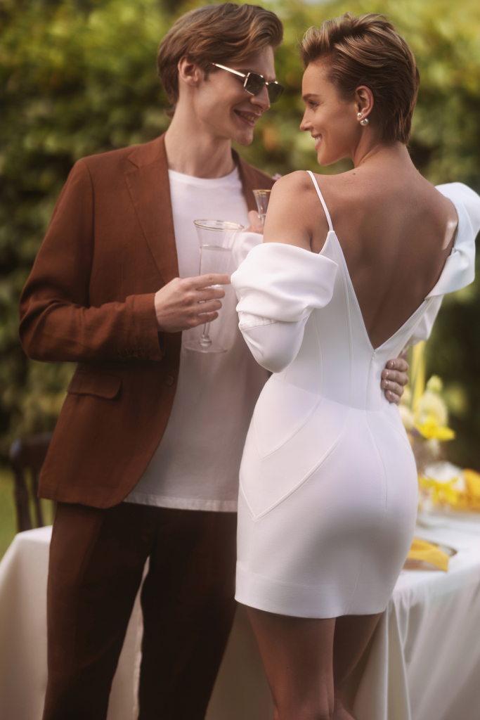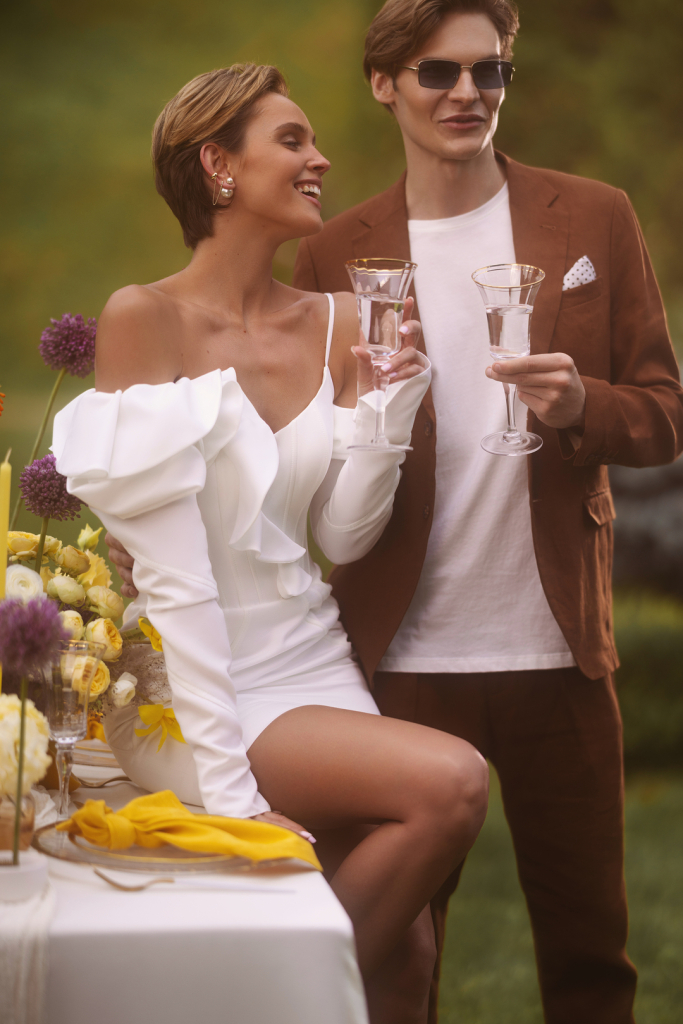 În ansamblu, rochia de cununie scurtă, din material simplu, cu maneci detasabile, corset cu balene ce evidentiază talia și un model de volane pe umăr este o alegere îndrăzneață și fermecătoare pentru o mireasă care caută un look contemporan și original în ziua cea mare. Este o rochie care îmbină eleganța și feminitatea cu elemente moderne și jucăușe, garantând astfel o apariție spectaculoasă și de neuitat