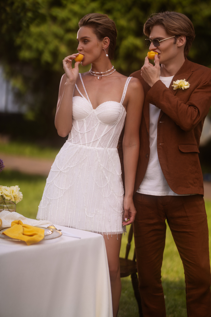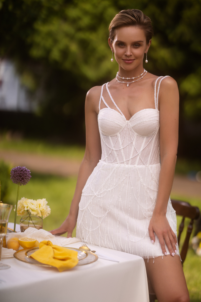 Astfel, rochia de cununie scurtă cu dantelă cu pietre tip lant, corset cu balene și bretele sofisticate este o alegere perfectă pentru o mireasă care dorește să strălucească și să impresioneze în ziua cea mare. Aspectul său elegant și detaliile atent finisate îi conferă un farmec aparte, transformând orice mireasă într-o apariție unică și memorabilă.