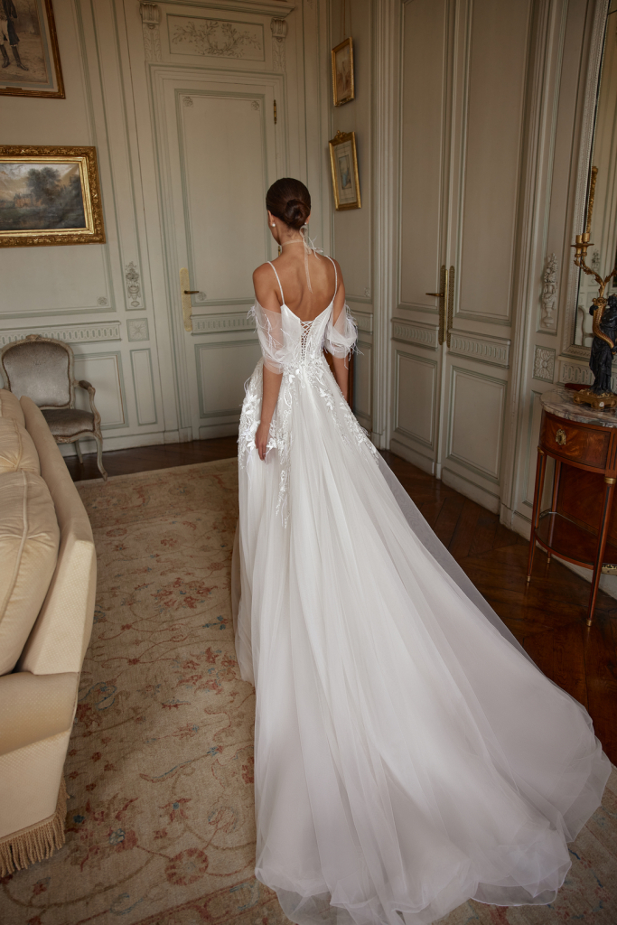 Rochie tip A line, corset  cu decolteu in forma V, brodat cu margele, bretele spaghetti brodate cu margele si altele din tulle detasabile. Spatele rochiei cu snur. Fusta cu crapatura creeaza un aer libertin.