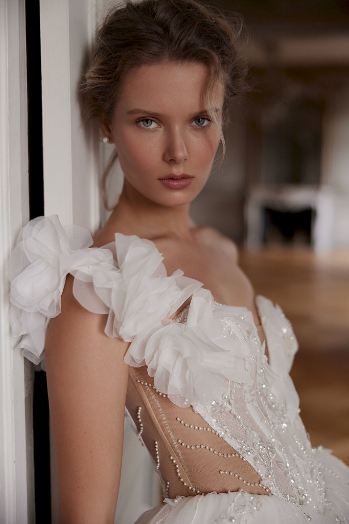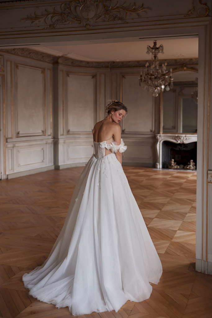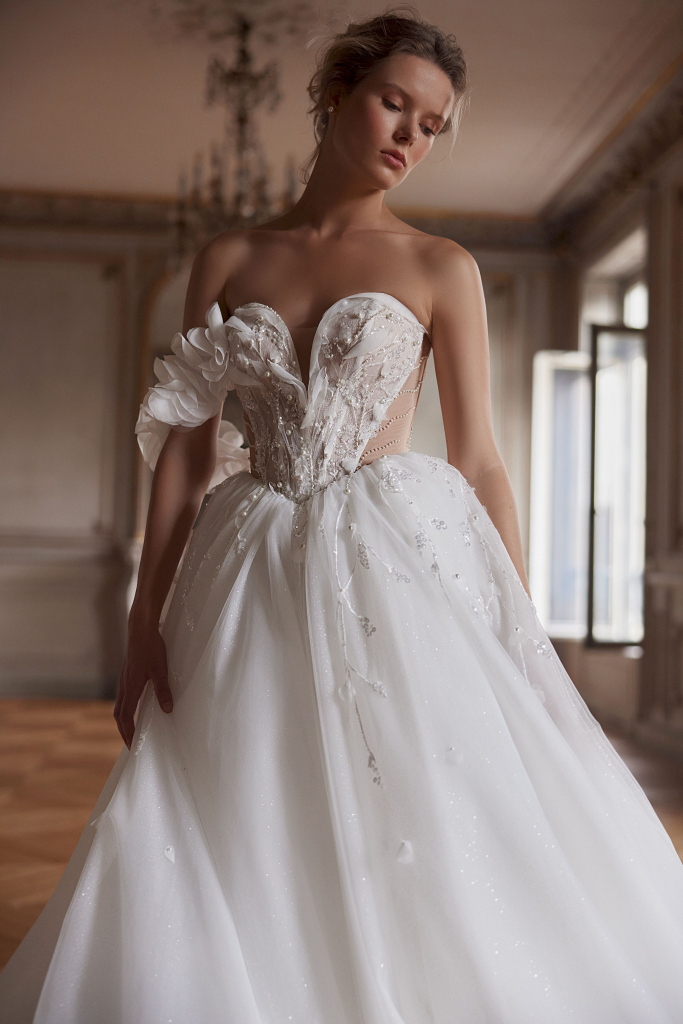 Rochia de mireasă este o adevărată capodoperă, compusă din mai multe straturi de tulle de diferite tipuri, inclusiv tulle sclipitor. Decorată cu flori voluminoase din organza, aceasta emană eleganță și rafinament. Broderia cu mărgele, paiete și perle adaugă un strop de strălucire, în timp ce nuanța de ivory conferă o delicatețe aparte. Corsetul, în nuanță de nude, completează perfect această creație, oferind un aspect sofisticat și romantic.