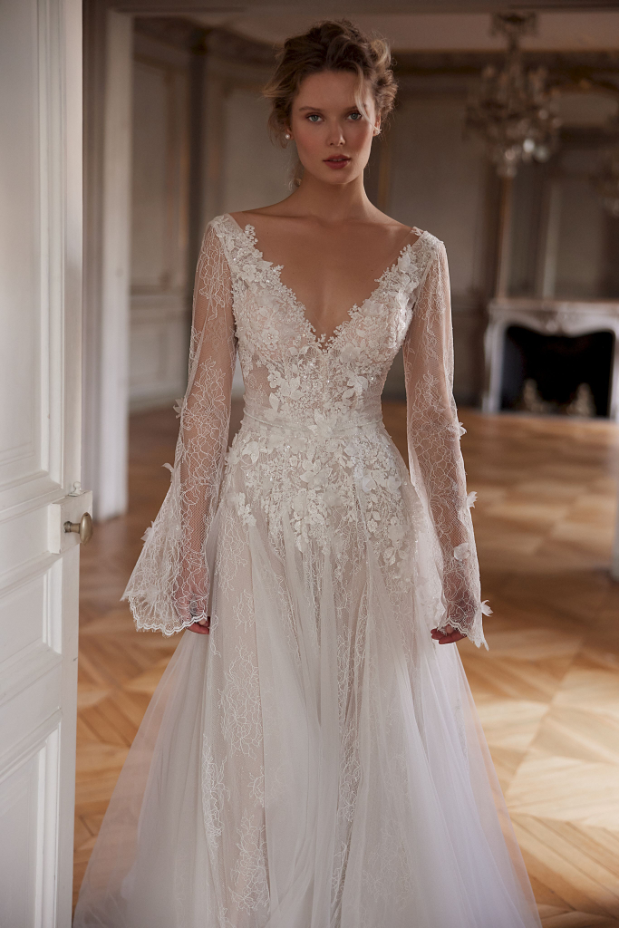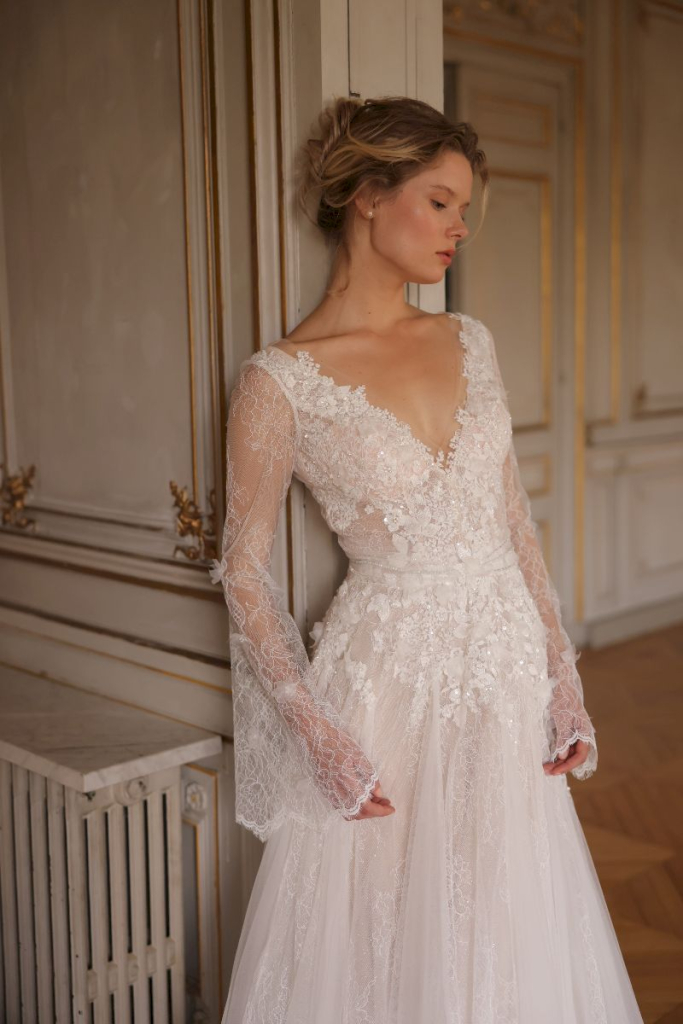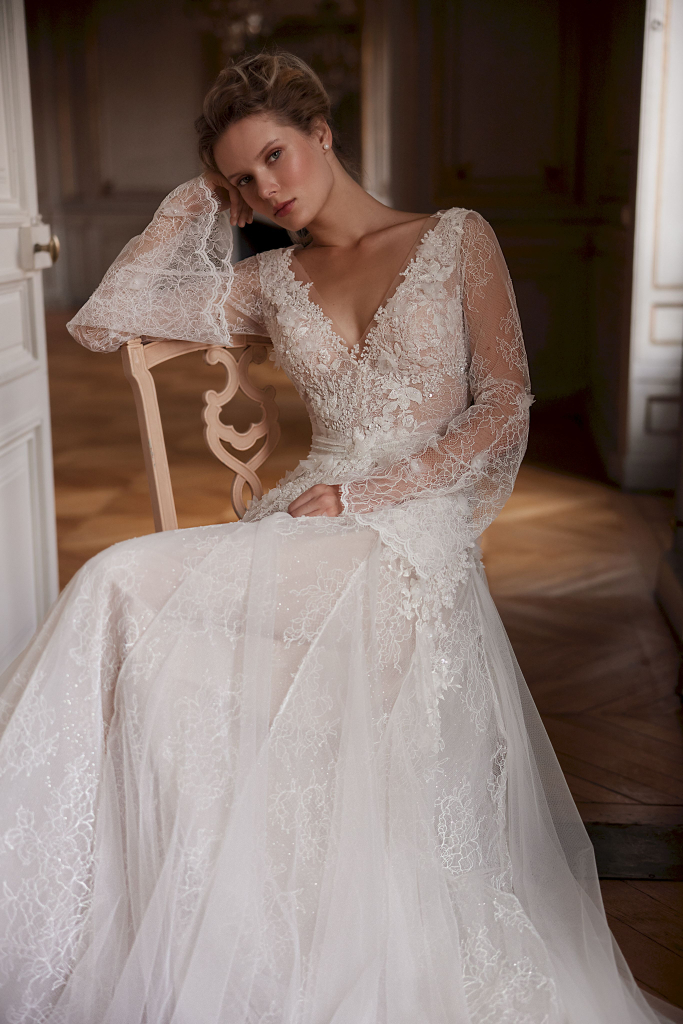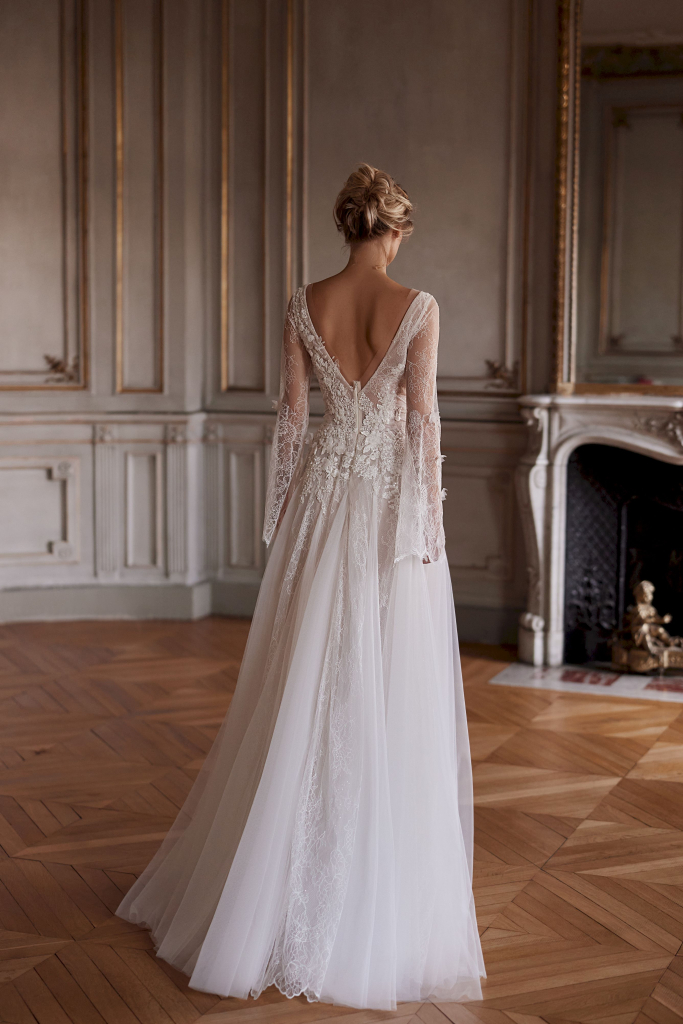 Rochia de mireasă A-line Shenon este o adevărată operă de artă, realizată din dantelă Chantilly delicată, care adaugă un aer romantic și sofisticat. Tulle-ul moale îmbrățișează silueta cu grație, creând o senzație de visare. Aplicatiile ofera un accent de eleganță, în timp ce broderia cu mărgele strălucește subtil, aducând un plus de strălucire. Detaliile cu paiete și perle completează acest design rafinat, iar cristalele adaugă o notă de magie. Întreaga rochie este îmbrăcată într-o nuanță de ivory, care emană puritate și frumusețe, făcând din fiecare mireasă o adevărată divă în ziua cea mare.