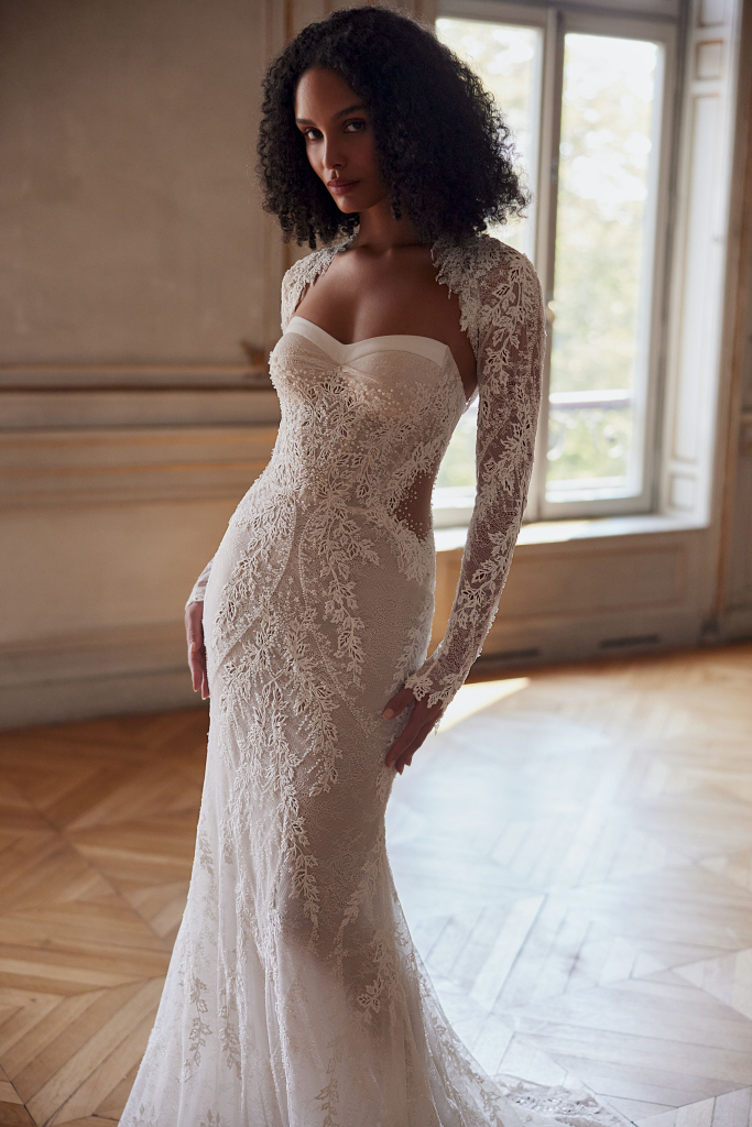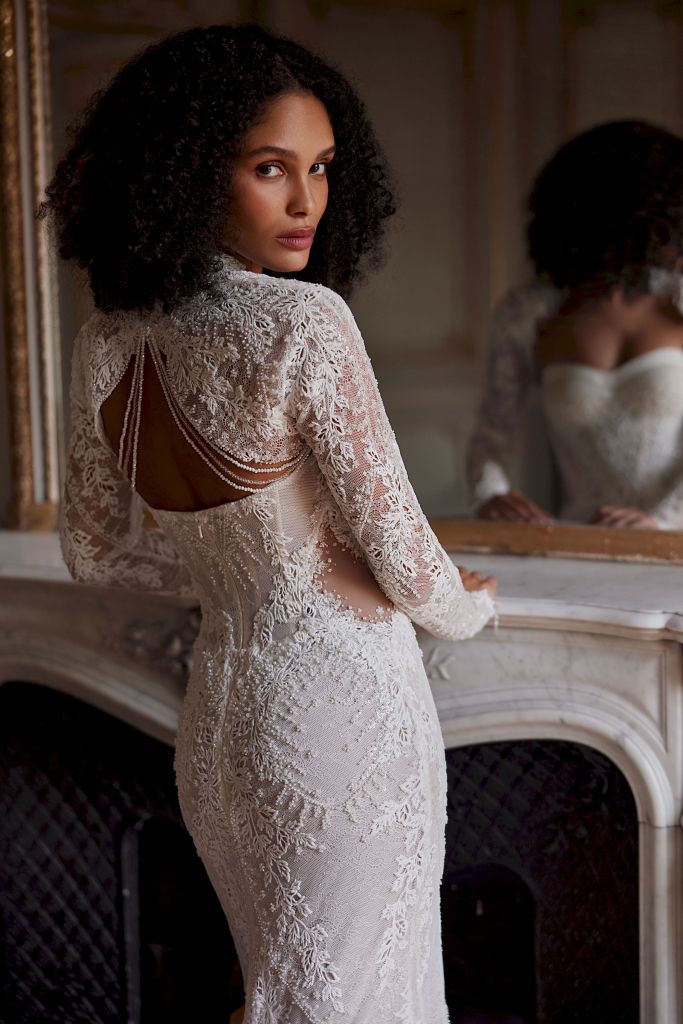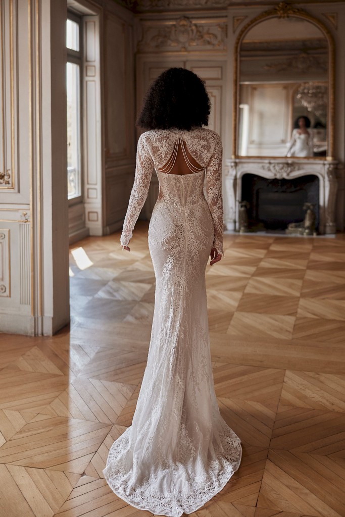 Rochia de mireasă este o adevărată capodoperă, realizată din dantelă Chantilly delicată și tulle. Corsetul, cu marginile în nuanțe de nude, oferă un aspect elegant și sofisticat, accentuat de aplicațiile din bumbac care adaugă un strop de originalitate. Broderia cu mărgele, paiete și perle strălucește subtil, aducând un plus de rafinament. Culoarea sa de ivory, împreună cu căptușeala în tonuri de nude, completează perfect această rochie de vis, transformând fiecare mireasă într-o adevărată prințesă în ziua cea mare.