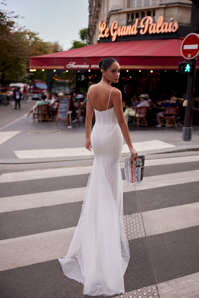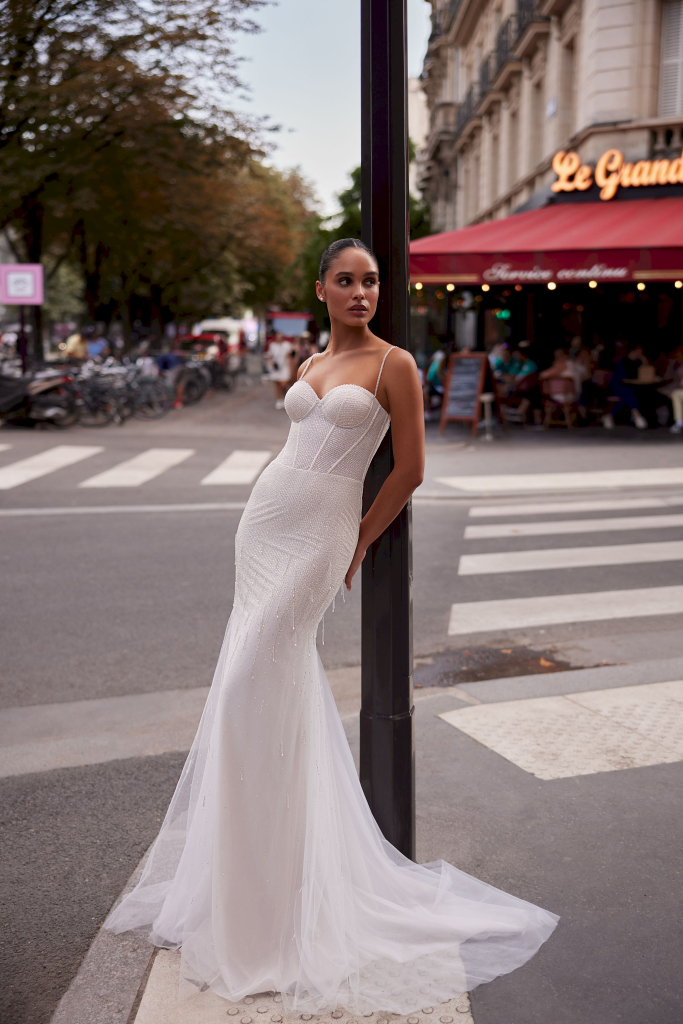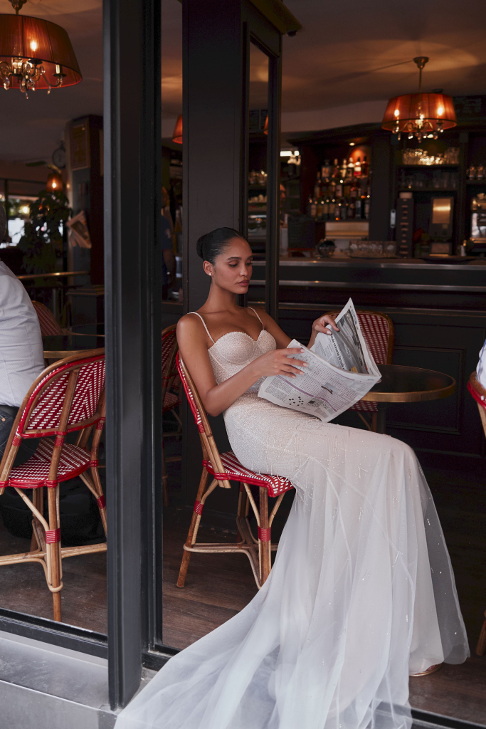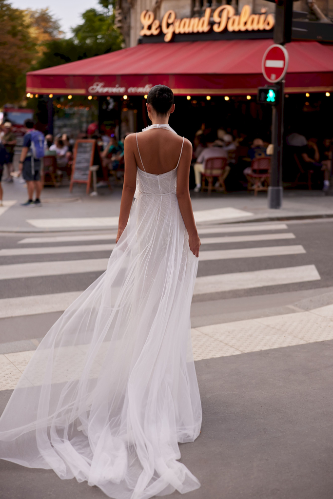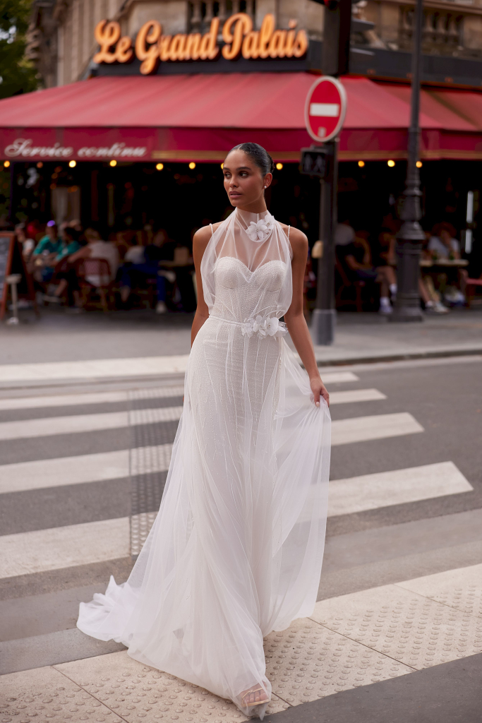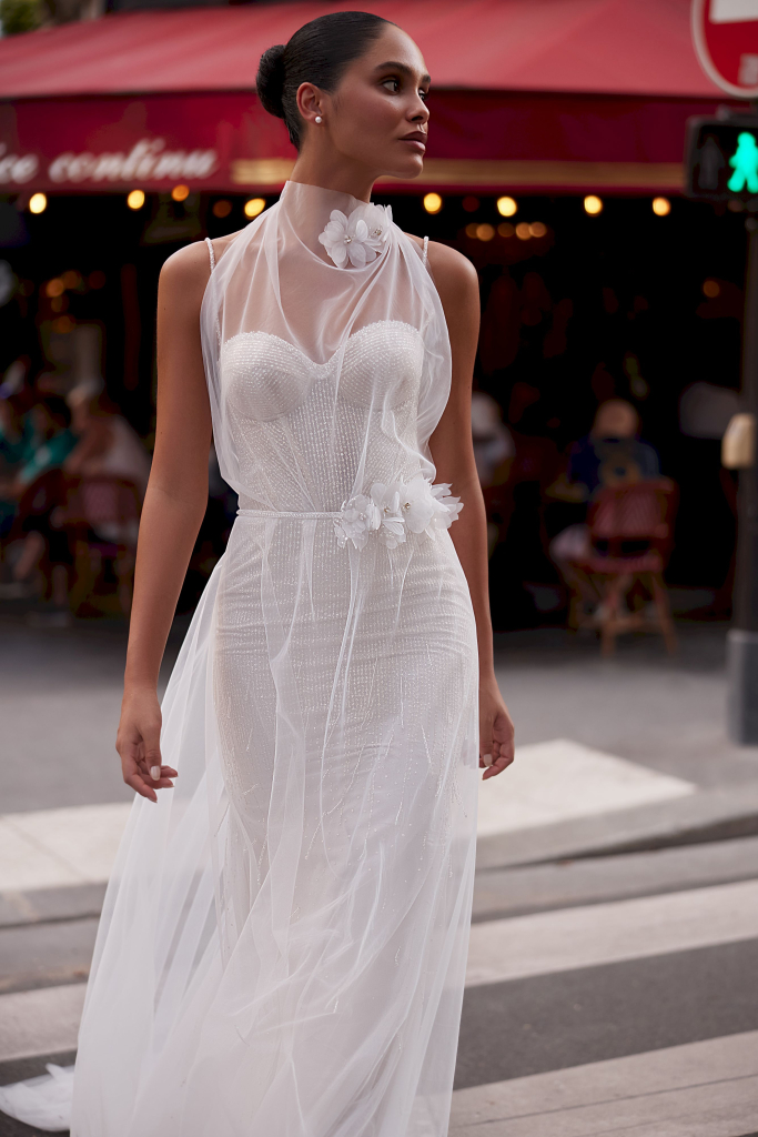 Rochia de mireasă este realizată dintr-un tulle elastic și strălucitor, împodobit cu broderie din cristale și aplicații de paiete și mărgele. Partea superioară a rochiei este confecționată din tulle moale, care adaugă o notă de delicatețe și eleganță. Aceasta dispune de o curea detașabilă, oferind astfel posibilitatea de a personaliza look-ul. Rochia are o nuanță rafinată de ivory, iar căptușeala în ton cu nuanța nude asigură un confort sporit și o siluetă impecabilă. Capa din tulle se poate achizitiona separat ea fiind inclusa in pret.
