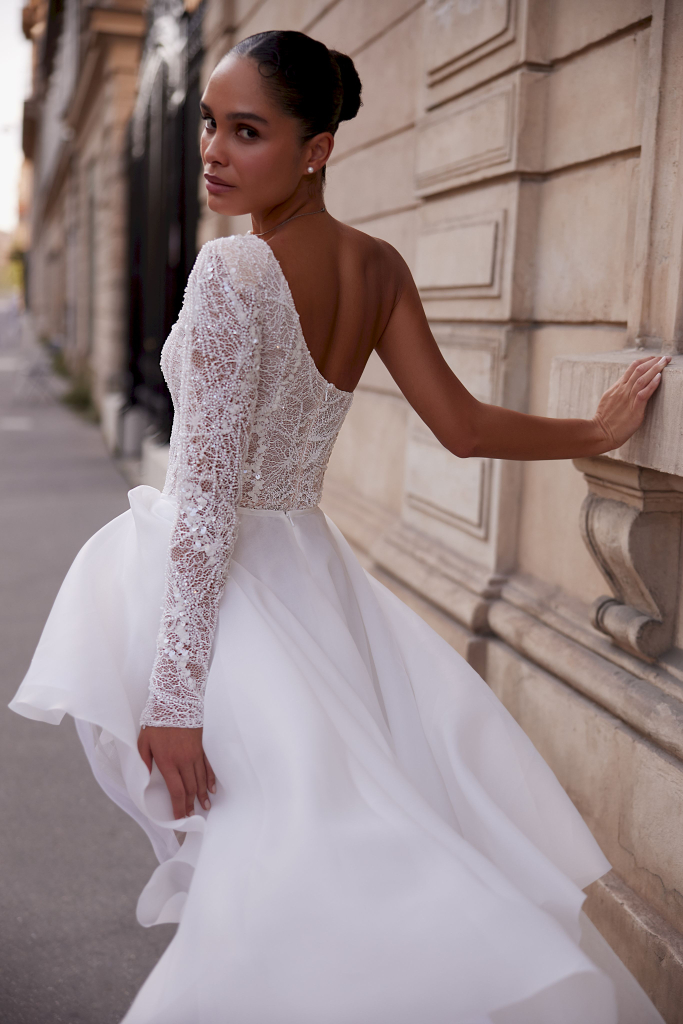 Rochia de mireasă este realizată din dantelă chantilly, împodobită cu broderie din paiete și mărgele, aducând un farmec deosebit. Detaliile din mărgele și perle completează perfect designul elegant al rochiei, care strălucește în nuanțe de ivoire. În interior, dantela este căptușită cu un tulle de culoare pielii, oferind un confort desăvârșit. Fusta din organza mată, care poate fi îndepărtată, conferă un aer sofisticat, iar tulul adaugă o notă de delicatețe. Această rochie nu este doar un articol vestimentar, ci o adevărată operă de artă, perfectă pentru cea mai importantă zi din viața unei mirese. Fusta detasabila se poate achizitiona separat, ea nefiind inclusa in pret.