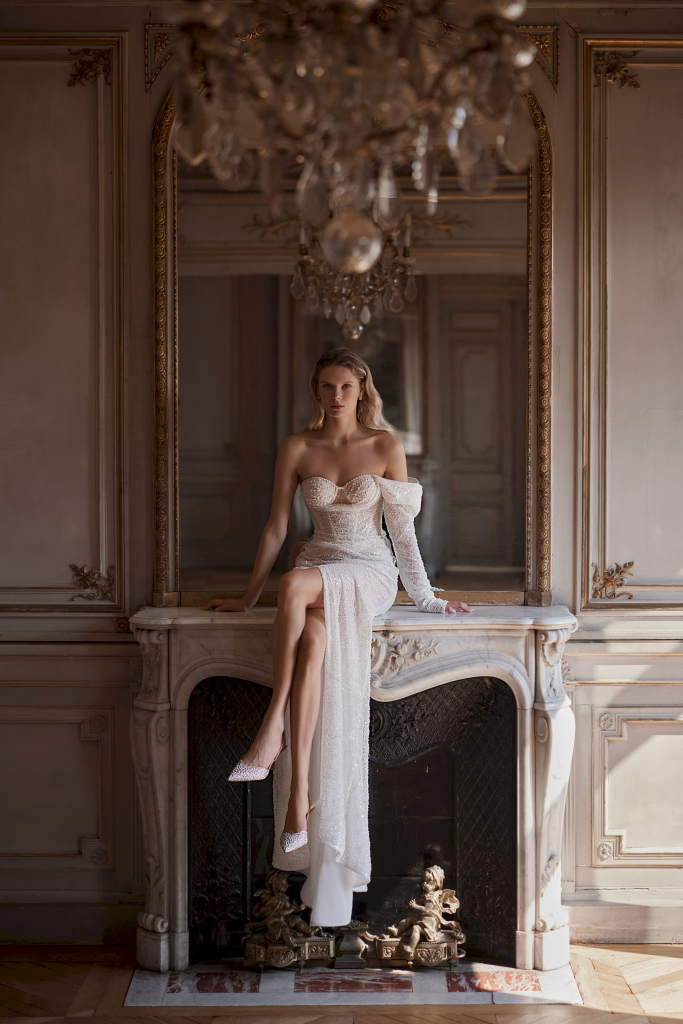 Rochia de mireasă este confecționată dintr-un tulle delicat, împodobit cu dantelă, brodat cu perle, paiete și mărgele bugle. Culorile ei fine de ivory adaugă o notă de eleganță și rafinament, transformând fiecare mireasă în centrul atenției în ziua cea mare.