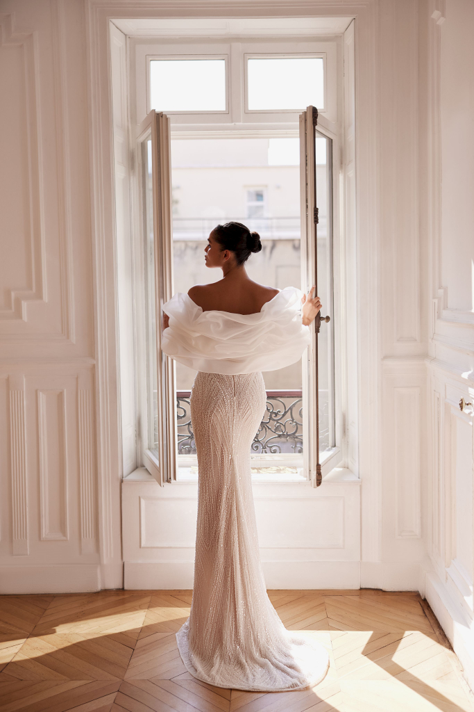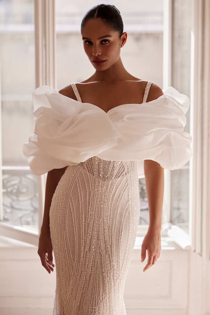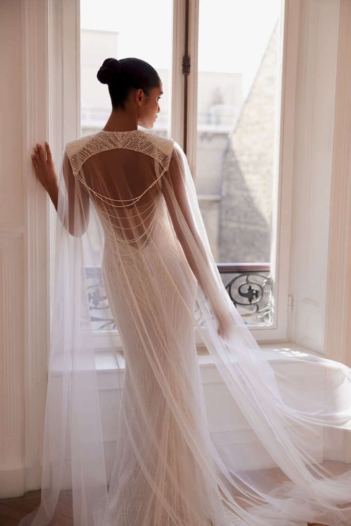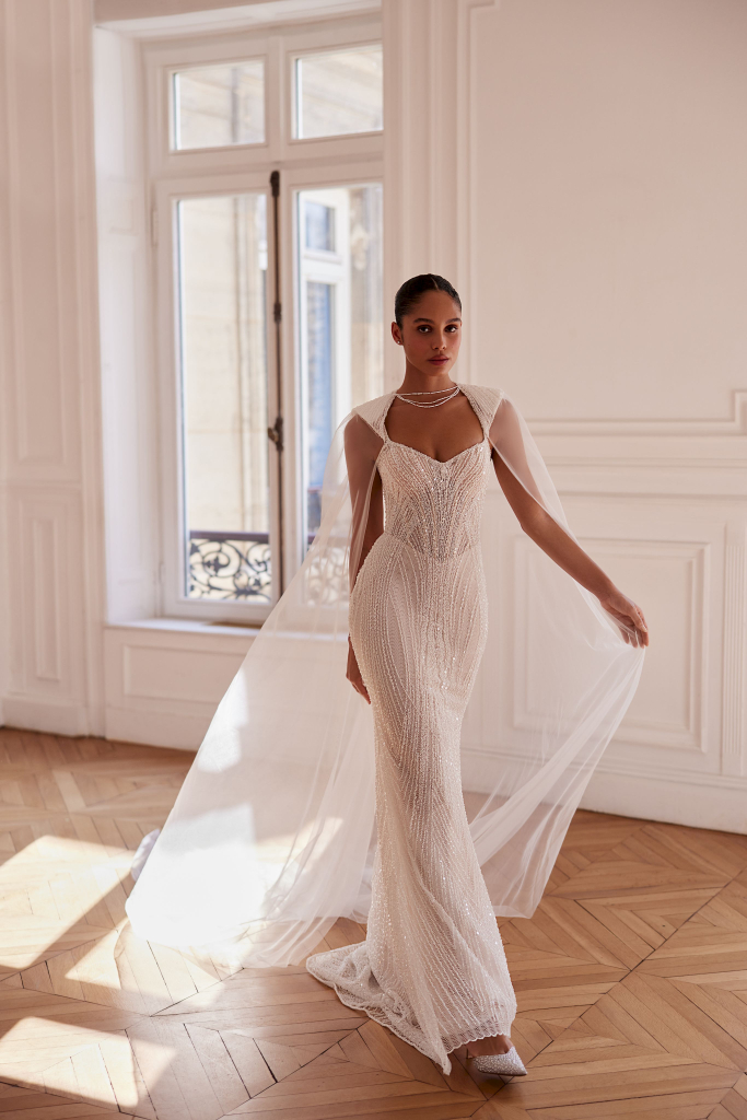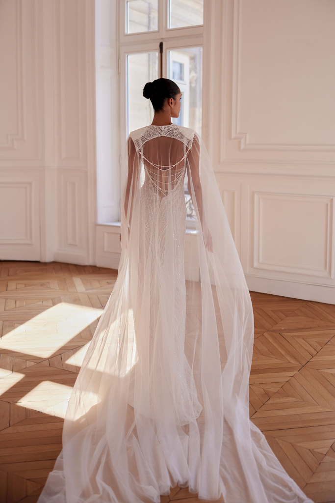 Îmbrățișând eleganța și rafinamentul, această rochie de mireasă este realizată din tulle moale, ce oferă un aer de delicatețe. Detaliile din dantela macrame, împodobite cu mărgele, paiete și broderie cu mărgele tip bugle, adaugă o notă de strălucire și sofisticare. Rochia, de o nuanță ivory, este căptușită cu un material de culoare nude, ce completează perfect designul. O capă din tulle moale cade grațios, în timp ce un bolero din organza mată adaugă un strop de eleganță, transformând fiecare apariție într-un moment de neuitat. Capa si/sau boleroul se achizitioneaza separat, ele nefiind incluse in pret.