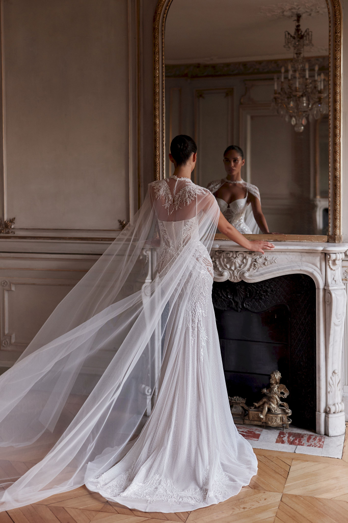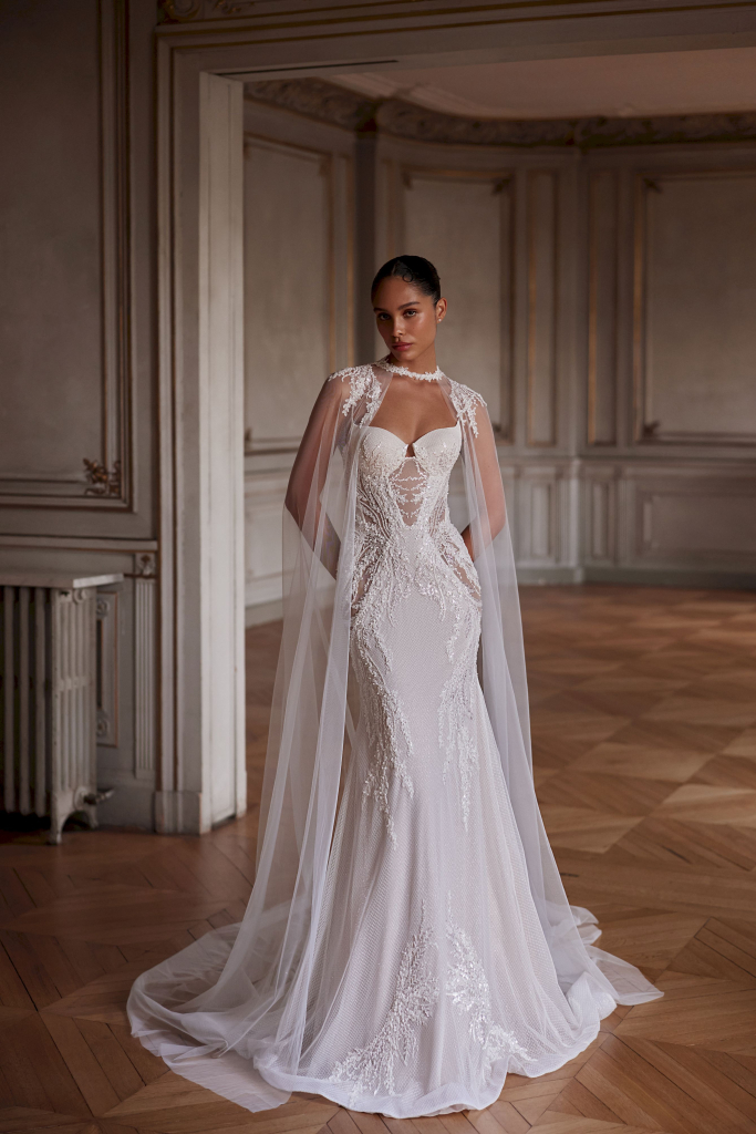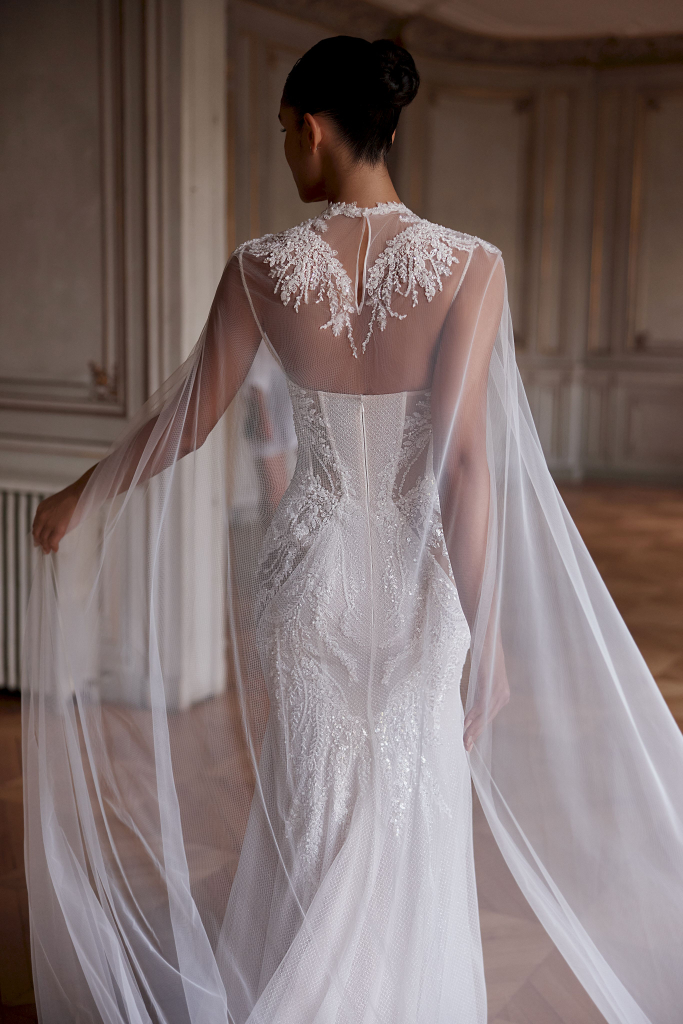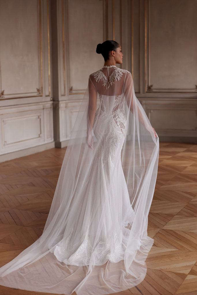 Rochia de mireasă sirena Oriana este realizată dintr-un tulle moale, ce strălucește delicat cu sclipiri dense. Detaliile ei sunt accentuate de aplicații elegante cu mărgele, paiete și broderii din perle, care adaugă un farmec aparte. Culorile se îmbină armonios, având un ton de ivory pentru rochie și o căptușeală în aceeasi nuanță . Această rochie emană o frumusețe rafinată, perfectă pentru cea mai specială zi. Separat, se poate achizitiona si boleroul ce intregeste rochia.