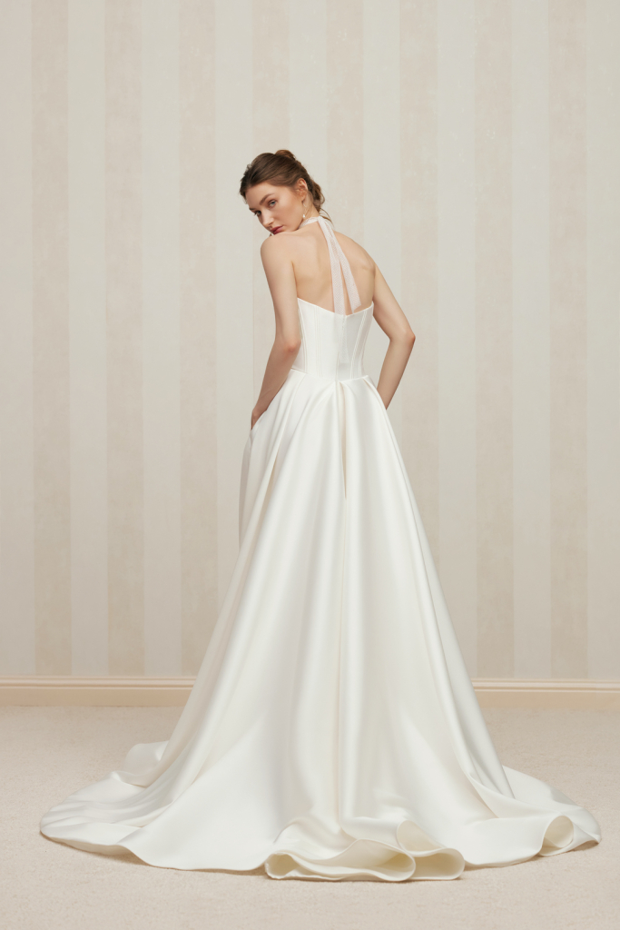 O rochie elegantă, cu un corset deosebit. Fusta cu pliuri adânci creează volum spre partea de jos. Are buzunare și o trenă mică. Confecționată din mătase Mikado, cu un luciu moderat nobil și un aspect luxos. Despicătura de pe fustă este “cuminte”, dezvăluindu-se la mișcări ample.