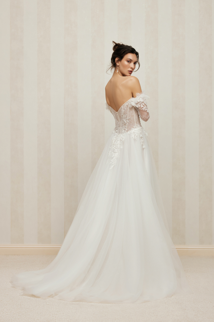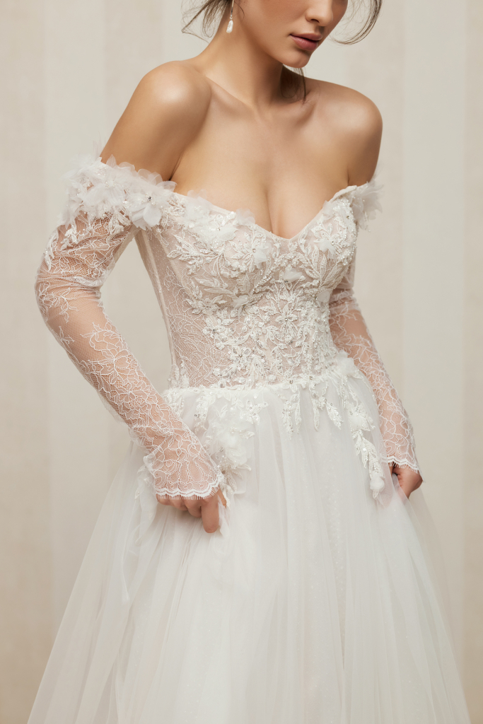 O rochie de mireasă romantică, ușoară și delicată, din tul fin și dantelă Chantilly. Decorată cu dantelă din vâscoză, broderie cu mărgele și cristale, paiete și flori lucrate manual. Are umerii goi și un decolteu delicat în formă de V.