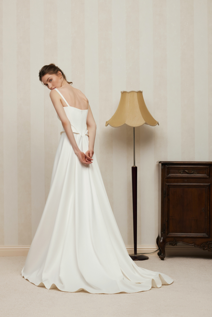 Corsetul are un decolteu pătrat și bretele spaghete, împodobite cu pliuri decorative pe laterale și o floare detașabilă lucrată manual.