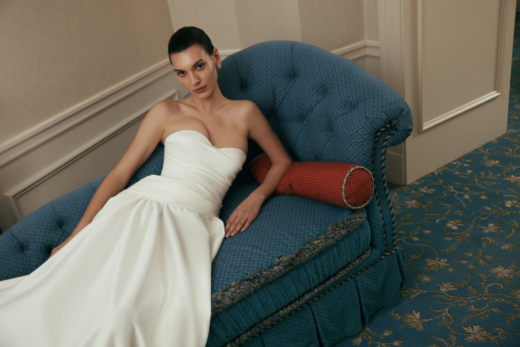 Rochie în formă de A, cu umerii goi. O rochie de mireasă simplă, dar sofisticată, ce poate fi accesorizată cu bijuterii speciale.