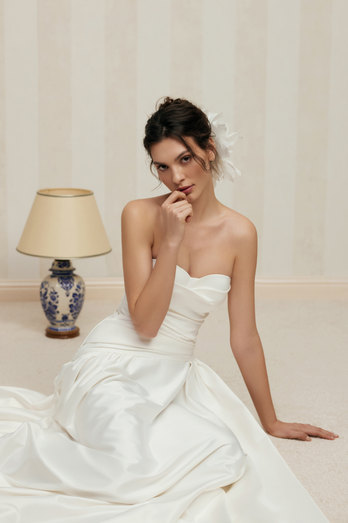 - Drapajul de pe corset se extinde până la șolduri, accentuând frumos silueta.