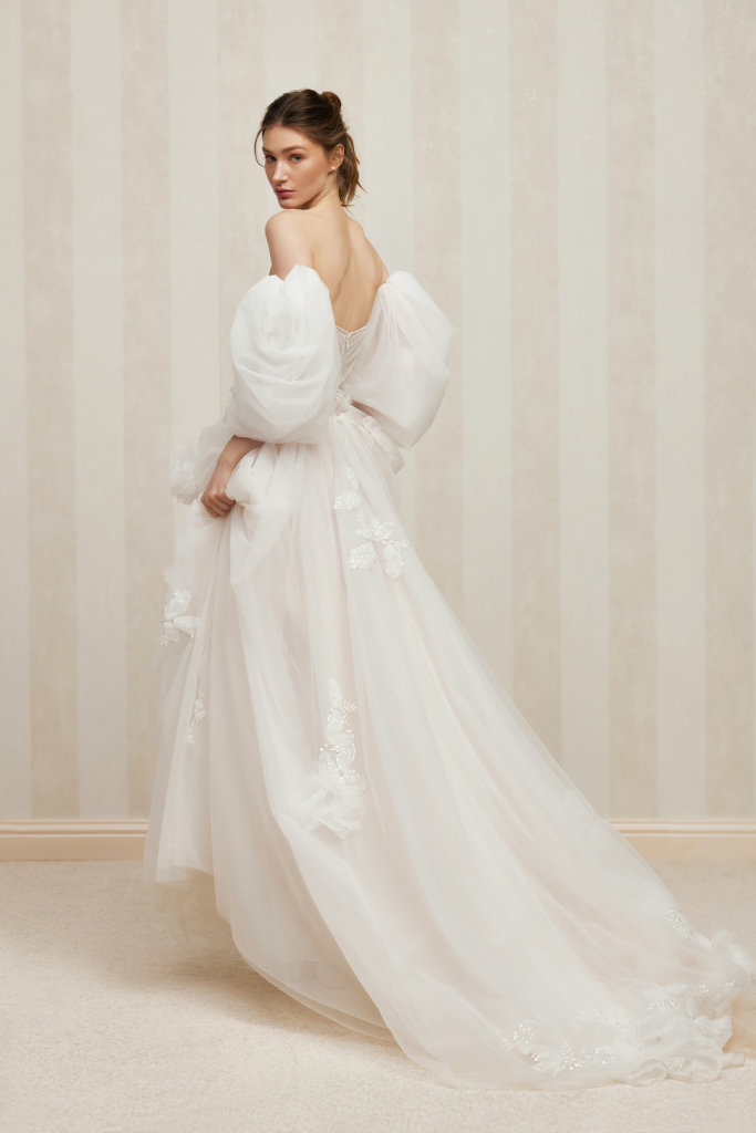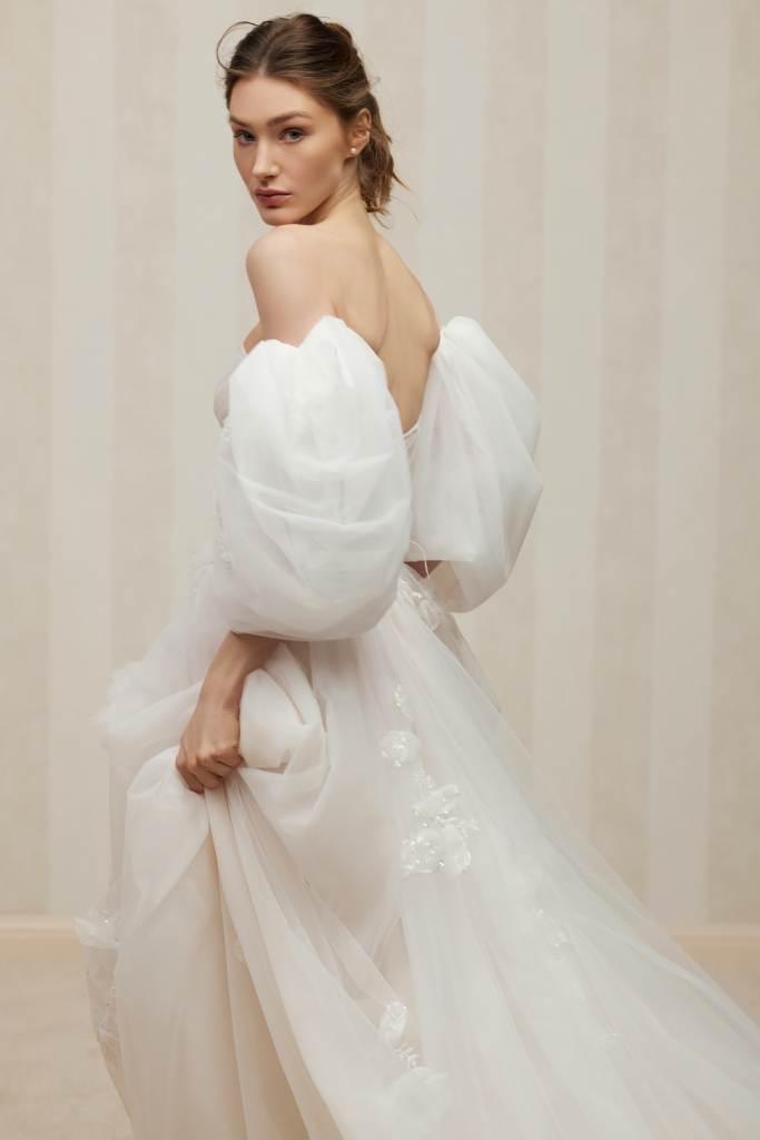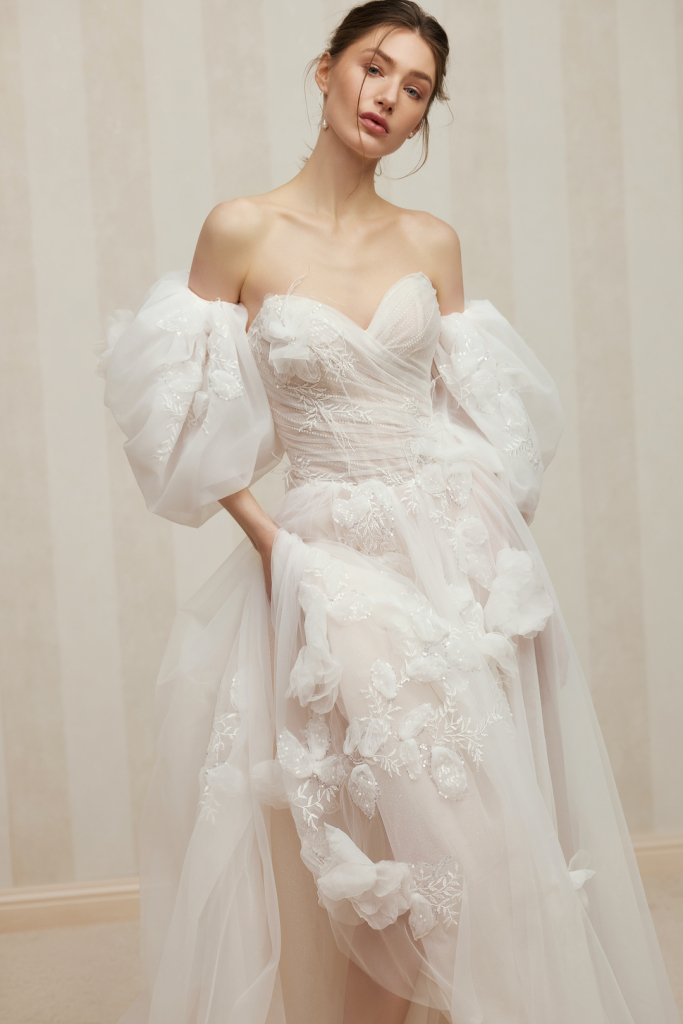 Mânecile rochiei iau forma unor petale voluminoase de flori și sunt detașabile.