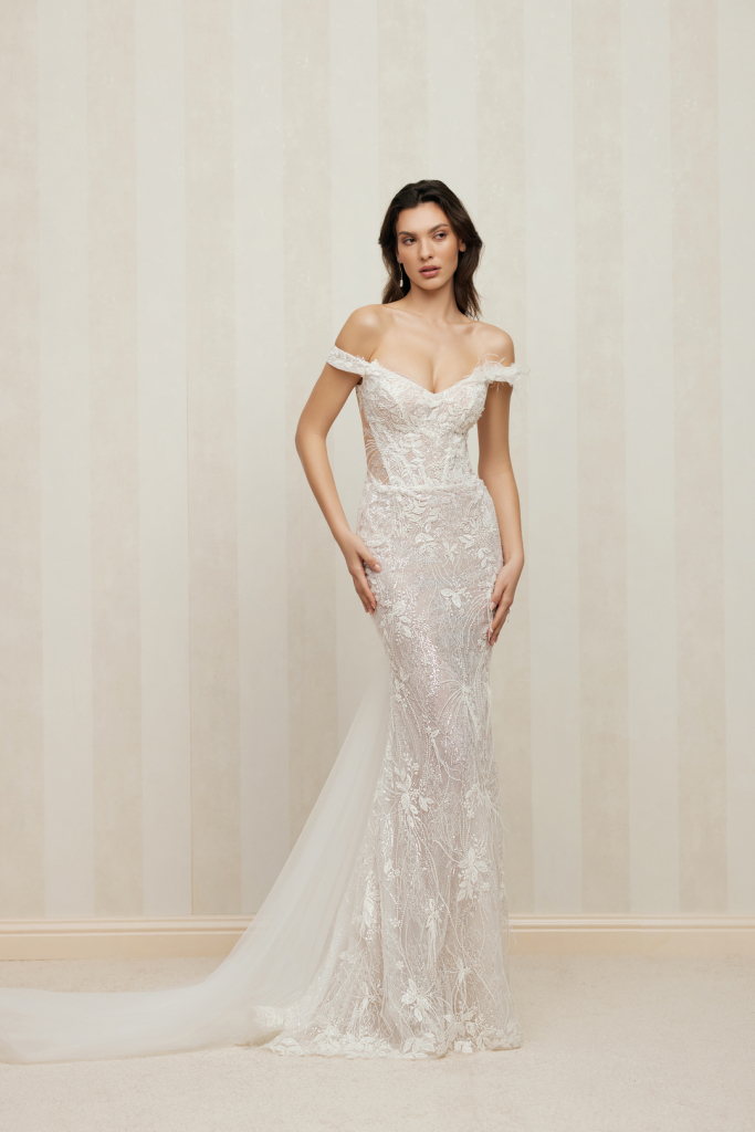 Rochia de mireasă Eliza este realizată din dantelă Chantilly și tul, cu o suprapunere delicată strălucitoare. Stratul superior este împodobit cu dantelă cu motive florale, paiete, mărgele și pene. O rochie stil sirenă elegantă și seducătoare, care îți va accentua silueta.
