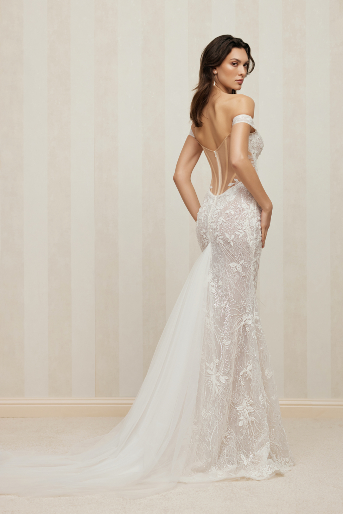 Fusta are o ușoară alungire la spate și include o trenă detașabilă din tul moale.