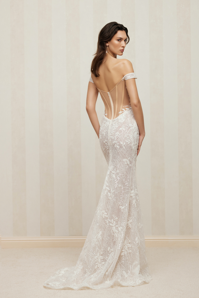 Are un corset cu un decolteu moderat în formă de V, părți laterale și spate transparente și bretele în cascadă.