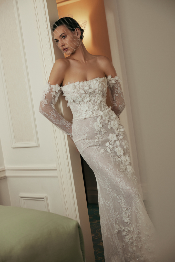 Rochie de mireasă sirenă, rafinată și seducătoare, cu umerii dezgoliți și mânecile lungi.