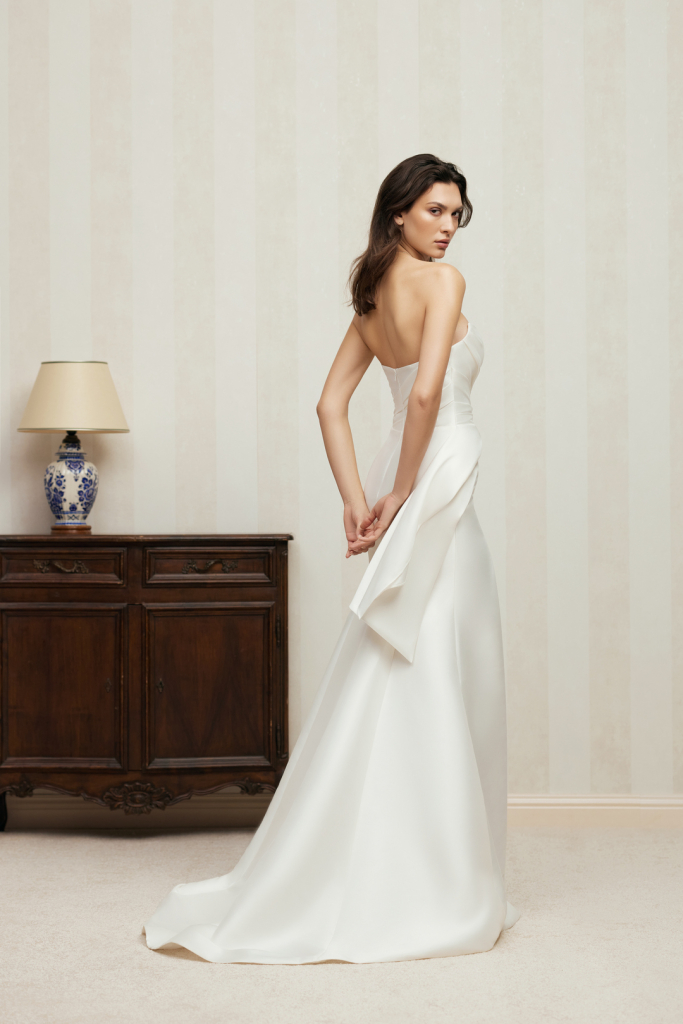Rochia vine cu o caracteristică transformatoare: o trenă lungă separată cu pliuri voluminoase, care poate fi atașată în partea de sus a fustei, ridicând ansamblul la o ținută mai ceremonială.