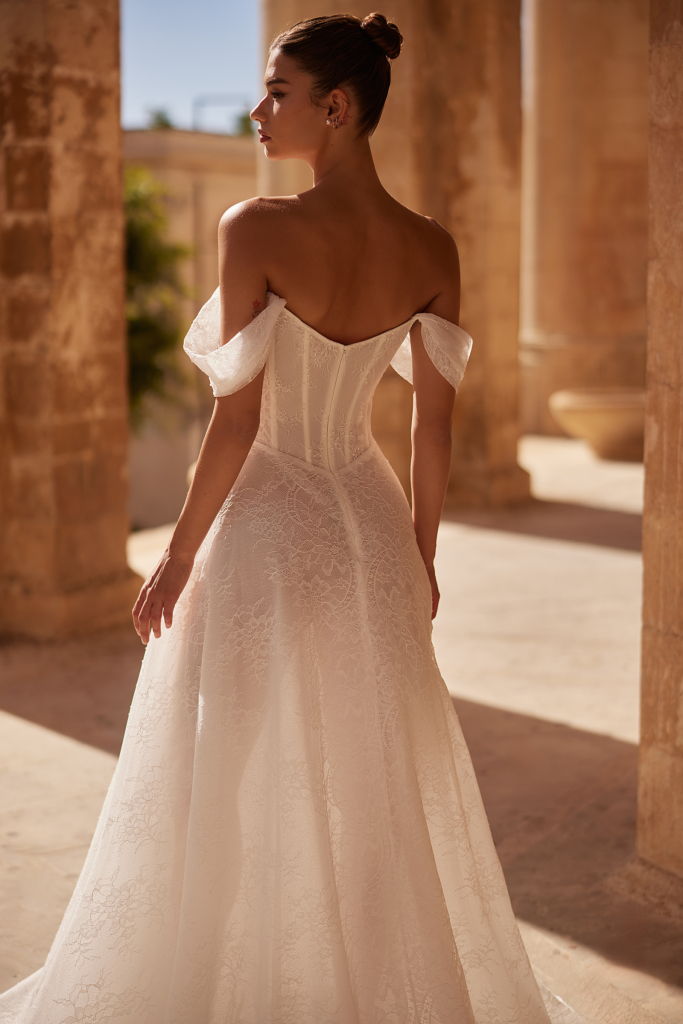 Descoperă rochia de mireasă A-line din tulle elegant, decorată cu dantelă fină și bretele cazute pe umeri, pentru un look romantic și sofisticat. Design-ul unic în zona cupelor, inspirat de simbolul infinit, adaugă un accent de originalitate și rafinament, în timp ce detaliile delicate de mărgele finuțe completează perfect această creație de poveste.