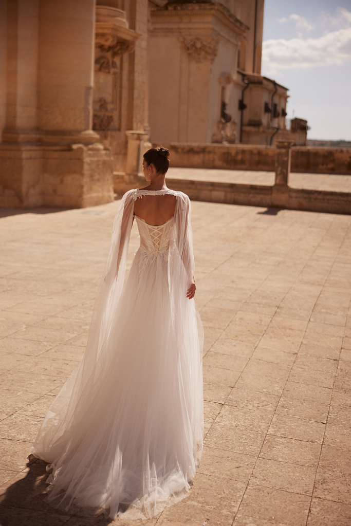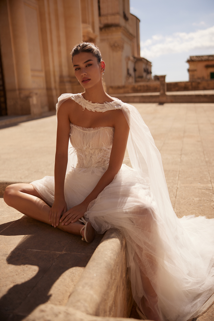 Rochie A-line usoara, realizată din tulle cu un efect similar dantelei. Corsetul are un decolteu drept și sculptat, decorat cu drapaje și aplicații voluminoase. Rochia este împodobită cu pene naturale, accentuând ușurința și caracterul delicat al ținutei. Fusta este adunată în pliuri fine, care cad lin și se lărgesc spre jos, creând o formă asemănătoare unui nor.