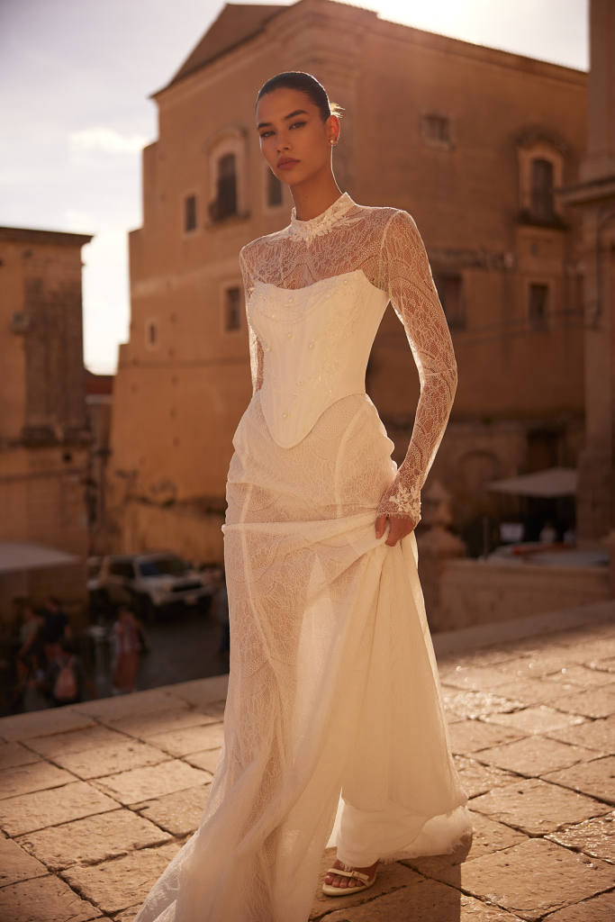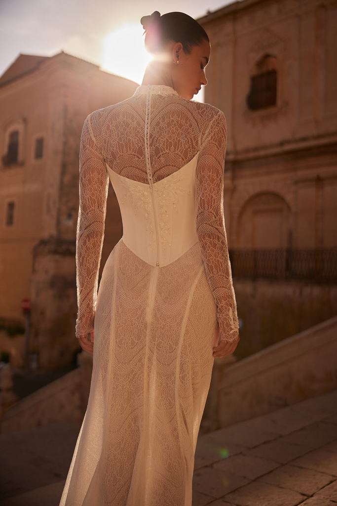 Descoperă eleganța desăvârșită cu rochia de mireasă sirena, un design sofisticat și rafinat. Cu maneci lungi și detalii delicate din dantelă fină, inclusiv pe gat, această rochie subliniază frumusețea și feminitatea ta, oferindu-ți un look de neuitat în ziua cea mare.