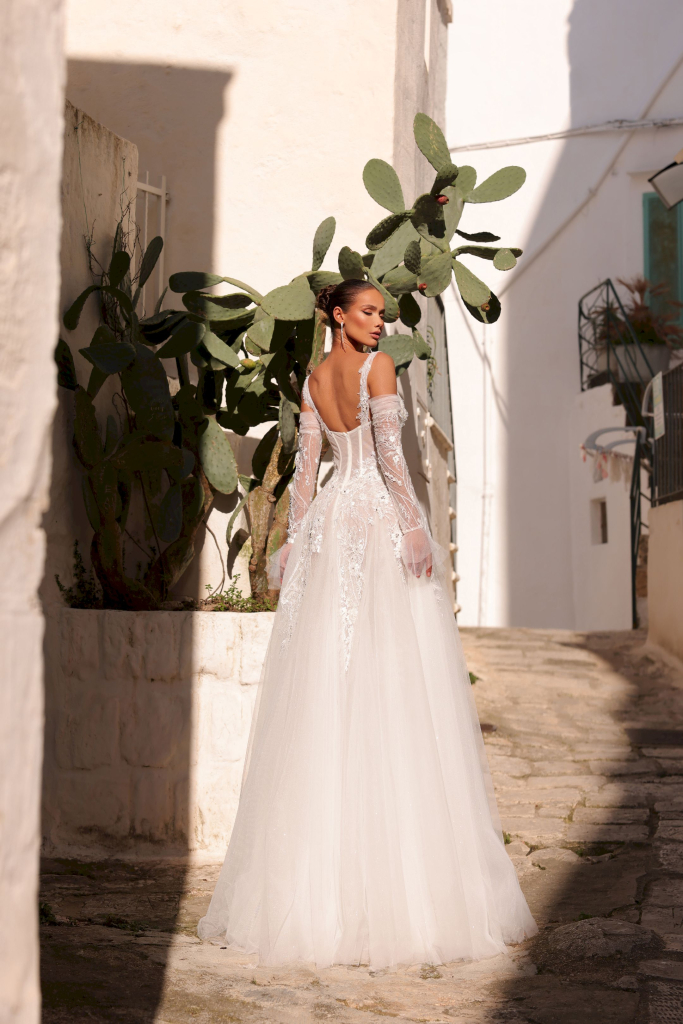 Rochia de mireasă Escara este confecționată din tulle și dantelă florală. Mânecile detașabile sunt o alegere opțională; se pot achiziționa separat.