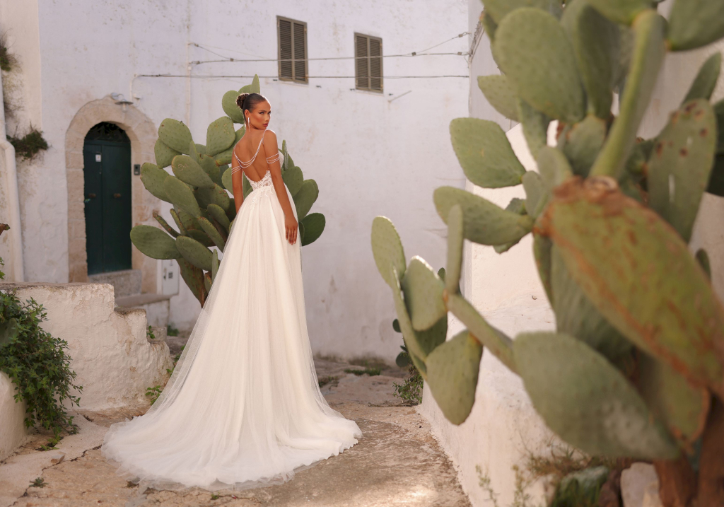 O rochie de mireasă A-line cu un design rafinat și romantic, un omagiu adus frumuseții naturale, oferind o apariție de poveste în ziua cea mare.