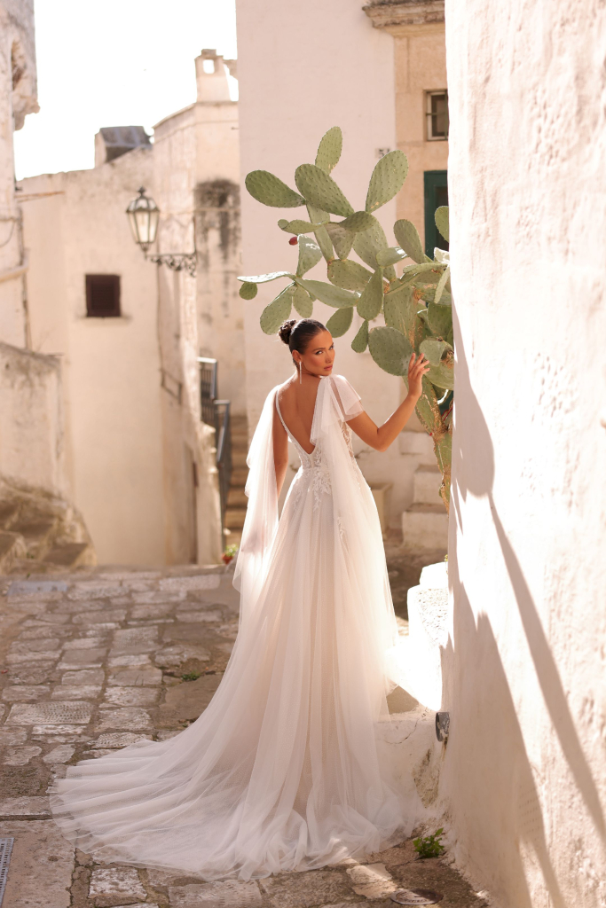 Vei pluti ca o adevărată zeiță în ziua nunții tale! Rochia de mireasă Myrra, cu o croială fluidă, din tulle diafan, este creată să-ți însoțească fiecare pas cu grație. Mânecile tip fluture completează perfect look-ul eteric și o siluetă care pare să danseze cu vântul.