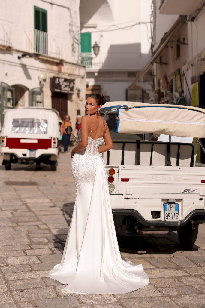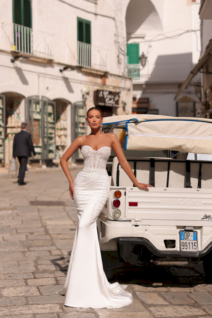Sloan – rochie de mireasă sirenă. Corsetul în formă de inimă este realizat din dantelă îmbogățită cu perle și cusături florale. Fusta din satin are aplicații florale cusute în partea de sus. Fusta rochiei se termină cu o trenă rotundă foarte scurtă.