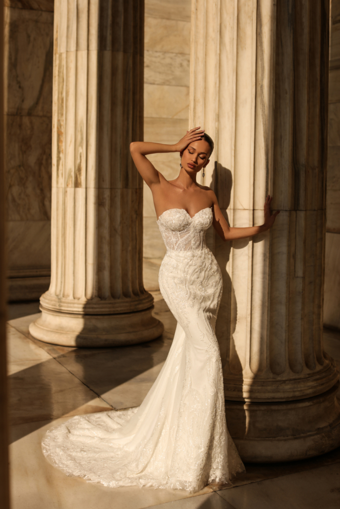 Rochie de mireasa 2 in 1. Rochie de mireasa tip sirena, corset transparent acoperit de dantela paietata si margele si capa detasabila, accesorizata din aceeasi dantela (inclusa in pretul rochitei).