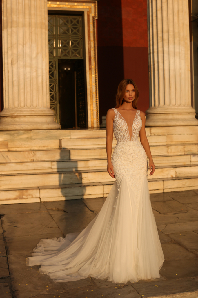 Rochie tip sirena cu dantela si aplicatii de margele ,corset cu decolteu adanc evidentiat printr-un sir de margele ce continua pe bretele si spatele in forma V.