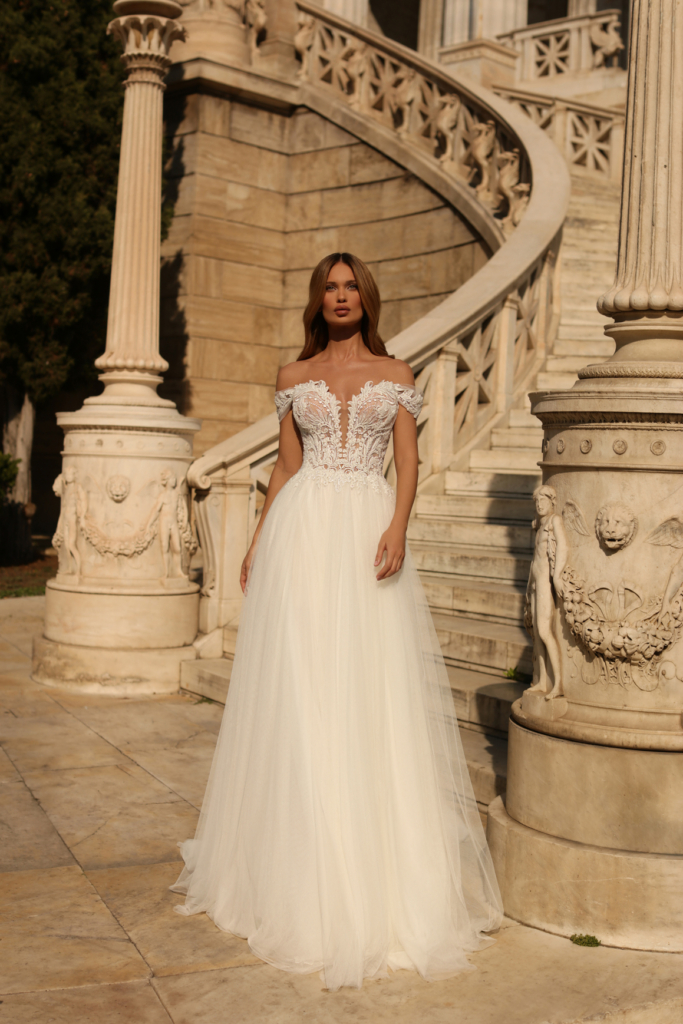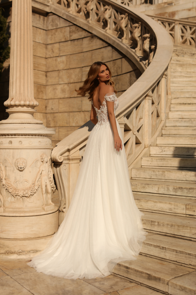 Rochie de mireasa tip linie A din tulle si corset transparent acoperit de dantela brodata cu margele, cu umeri deschisi .