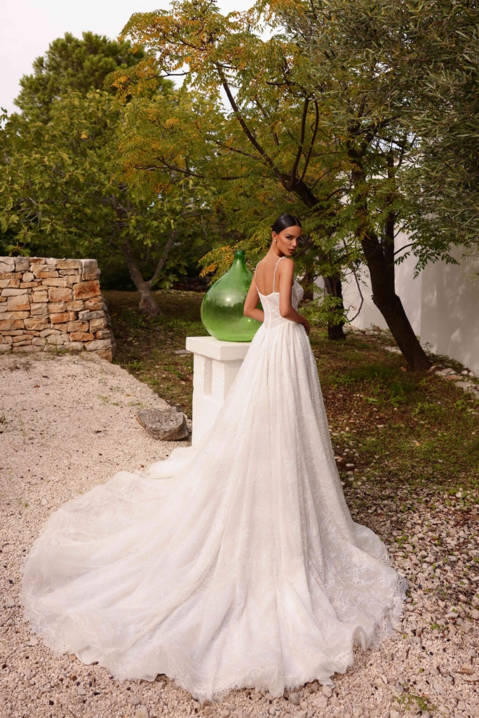 Rochia de mireasă Calla este o creație rafinată în stil A-line, concepută pentru mireasa care își dorește echilibrul perfect între romantism, strălucire și delicatețe. Silueta sa lejeră și feminină avantajează orice tip de corp, oferind o apariție grațioasă și plină de lumină.