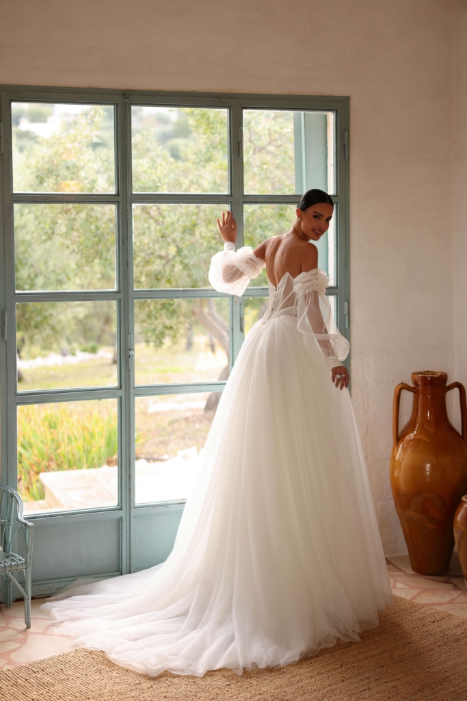 Pentru un look personalizabil, rochia Claire oferă și opțiunea de a adăuga mâneci detașabile din tulle, disponibile separat—o alegere ideală pentru miresele care vor să își transforme apariția între ceremonie și petrecere.