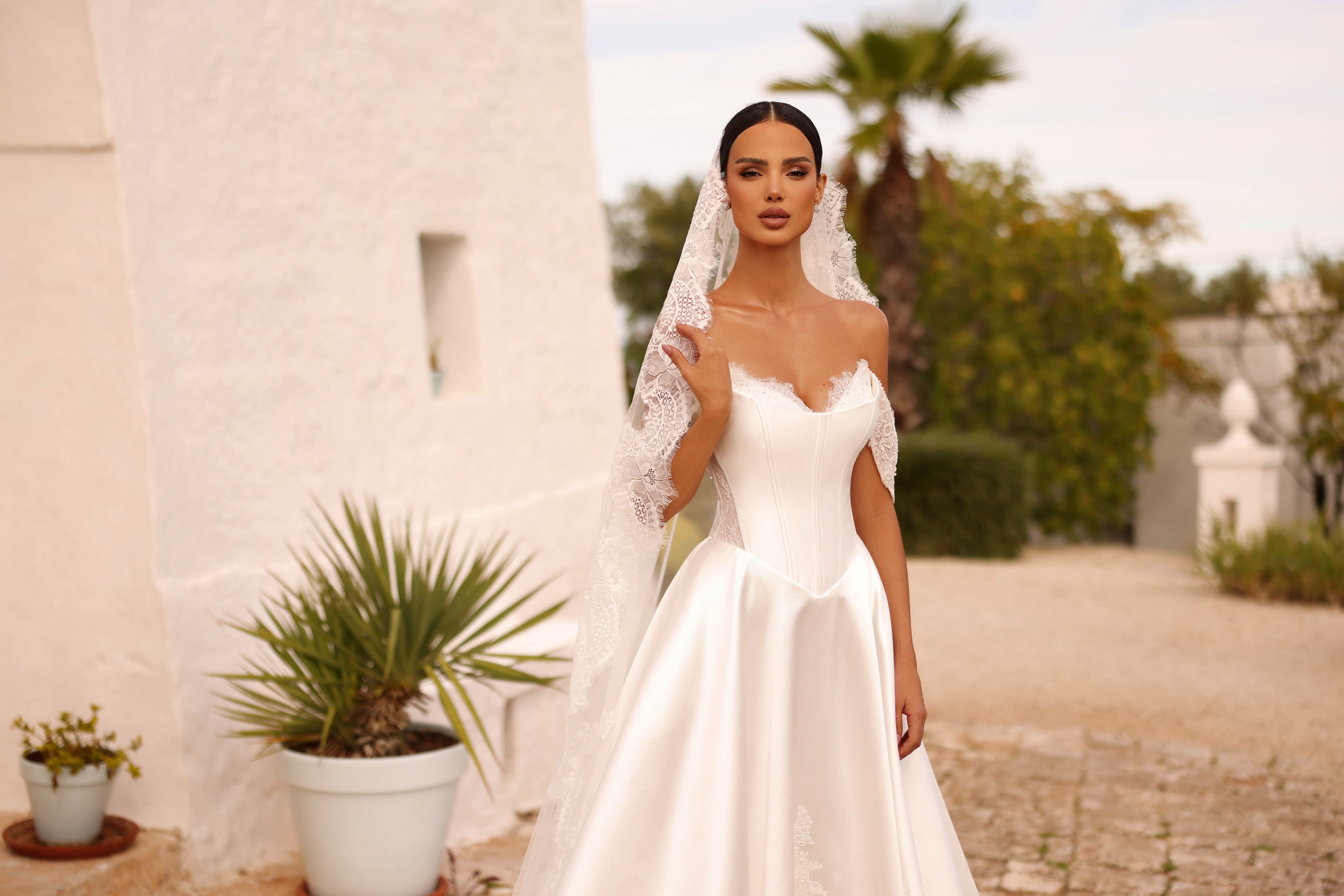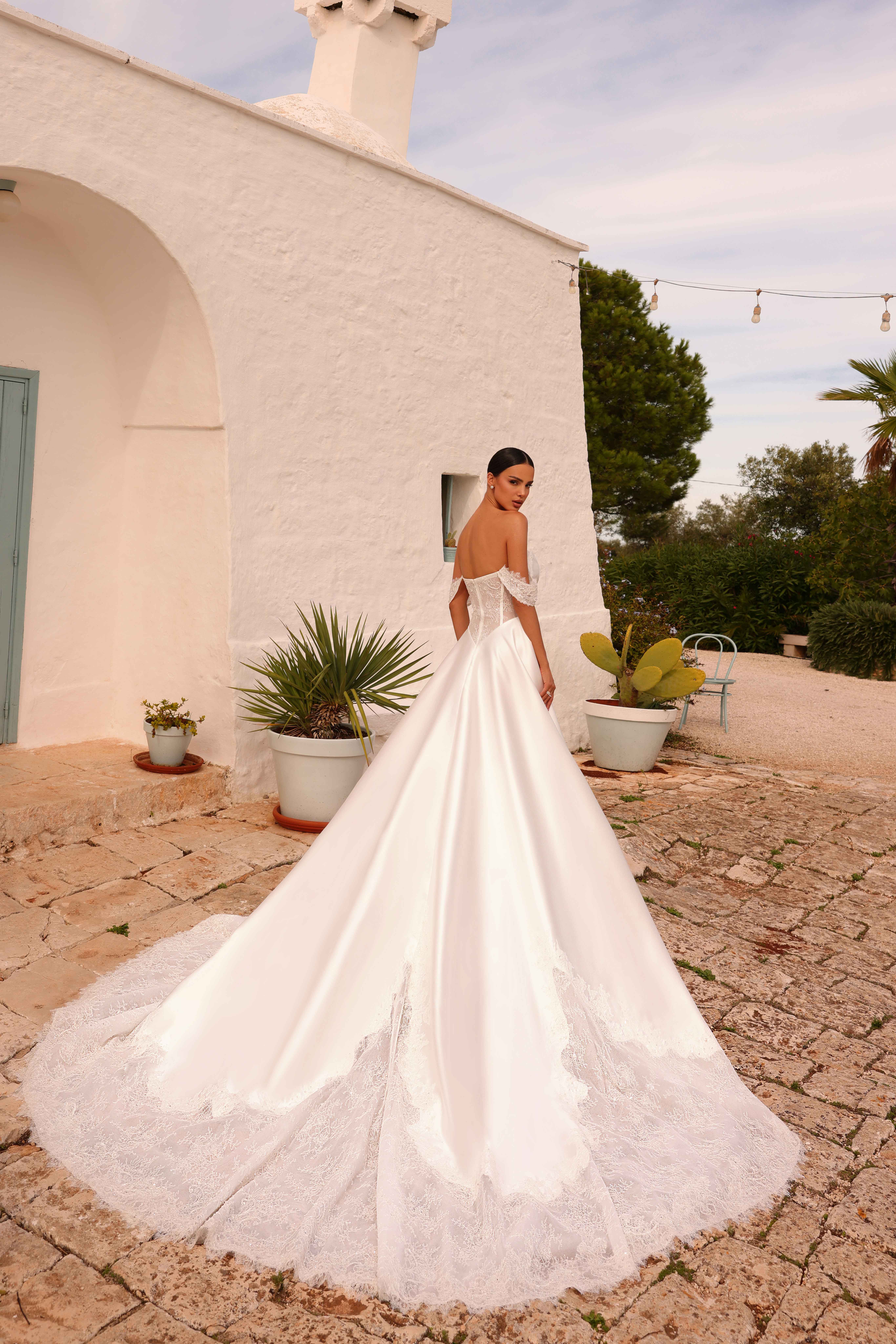 Margoty este rochia de mireasă perfectă pentru femeile care caută un design A-line sofisticat, o combinație de mikado regal și dantelă delicată, și o apariție care să impresioneze prin detalii fine și eleganță atemporală.