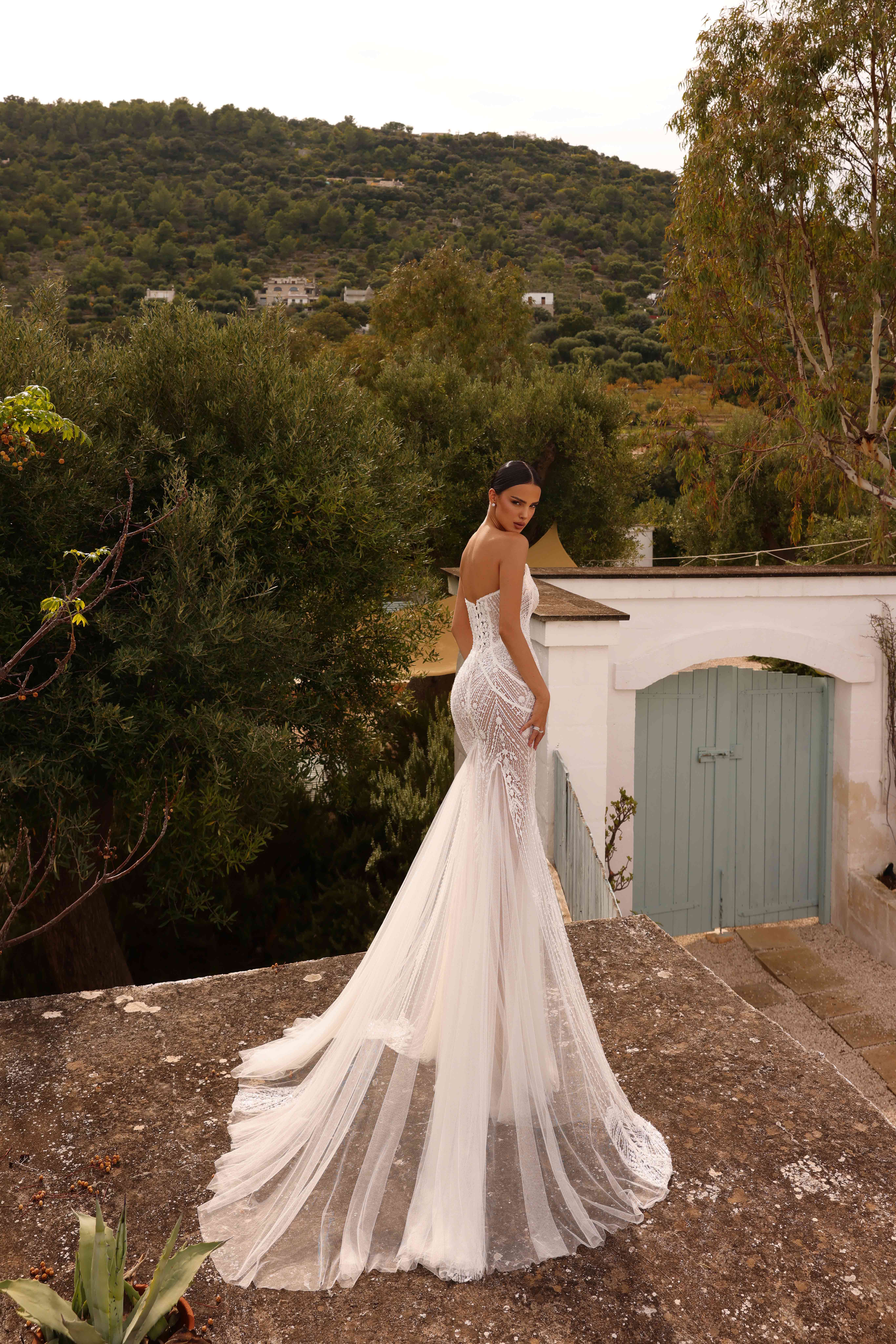 Decolteul cu colțuri aduce un aer contemporan și pune în valoare zona bustului, în timp ce modelul de dantelă se continuă armonios atât pe bust, cât și pe fustă, creând un efect vizual unitar și elegant. Fusta este completată de clini generoși din tulle, concepuți pentru a oferi volum echilibrat și o lejeritate aparte la mers, fără a compromite linia grațioasă a rochiei sirenă.