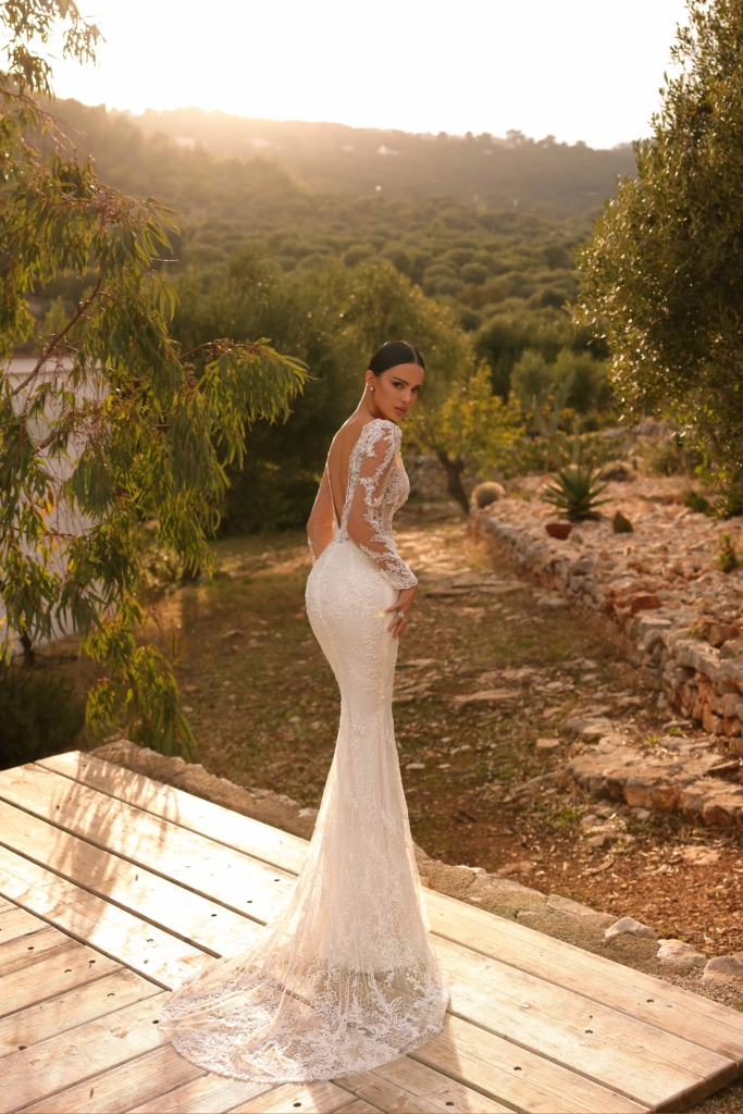 Bustul prezintă o bază nude, completată de un decolteu adânc și pronunțat, atât în partea din față, cât și în spate. Acest design spectaculos alungește vizual silueta și subliniază delicatețea umerilor și a liniei spatelui. Mânecele lungi, realizate din aceeași dantelă fină, adaugă o notă de eleganță și rafinament, echilibrând perfect senzualitatea decolteului.