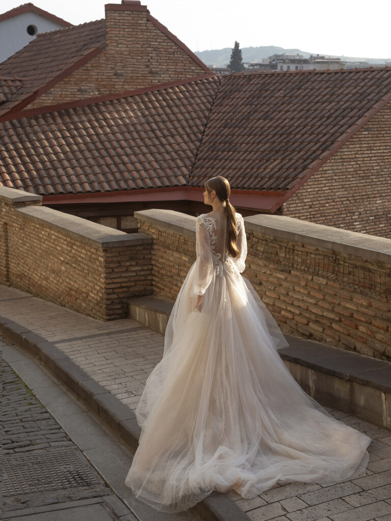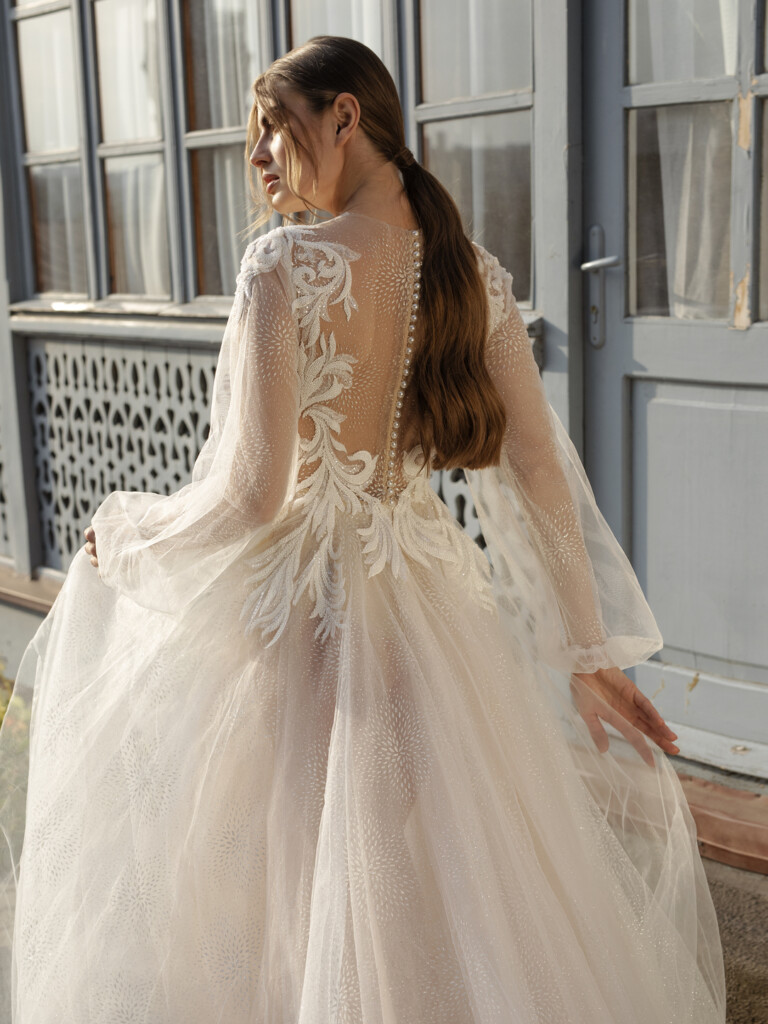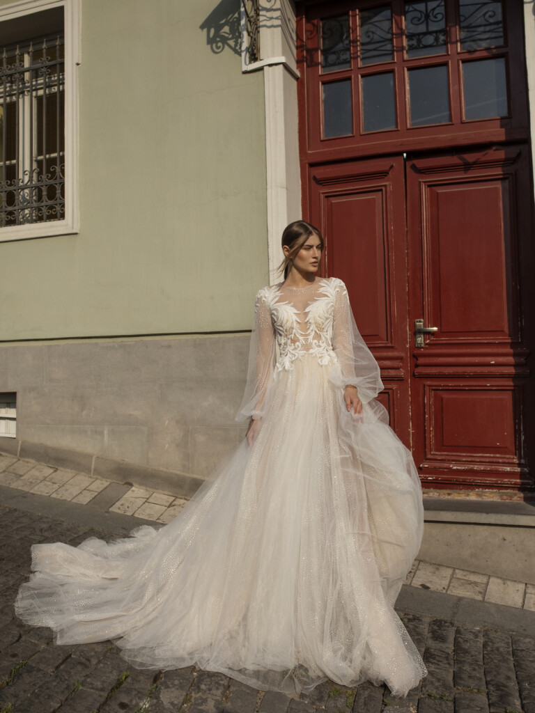 Efect romantic! Rochia de mireasa stralucitoare in linie A este un design de printesa, care este pregatita cu o dantela completa brodata cu bijuterii stralucitoare. În timp ce decolteul romantic oferă o postură impecabilă, fusta contesa dezvăluie subțierea taliei tale. Cu mâneci lungi, umflate, translucide, pentru o notă romantică și o fustă magnifică, fluidă, din tul stratificat. Ea este o piesă de artă rafinată, completată cu un spate frumos perlat.