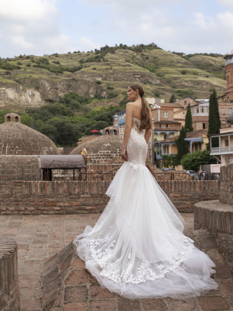 Acest design oferă un pic mai mult sprijin cu o înflorire cochetă. O rochie cu coadă de sirenă, o dantelă florală rafinată cu o frumoasă aplicație din tul adaugă o calitate frumoasă stratificată acestei rochii de mireasă romantică, care are un decolteu în formă de inimă cu mâneci umflate de pe umăr.