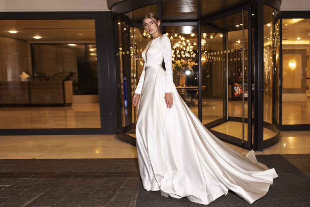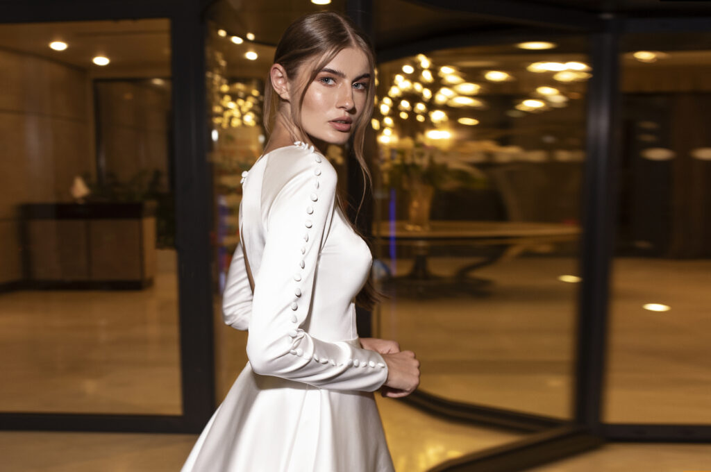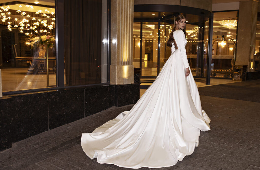 O rochie de mireasă uimitoare, rochie de bal regal, cu un aspect simplu și elegant, dar magnific. Mikado este o țesătură asemănătoare mătăsii, cu un decolteu deschis, fără spate și mâneci lungi decorate cu nasturi perlați pentru un aspect nobil. Proiectat cu gandul la regine .