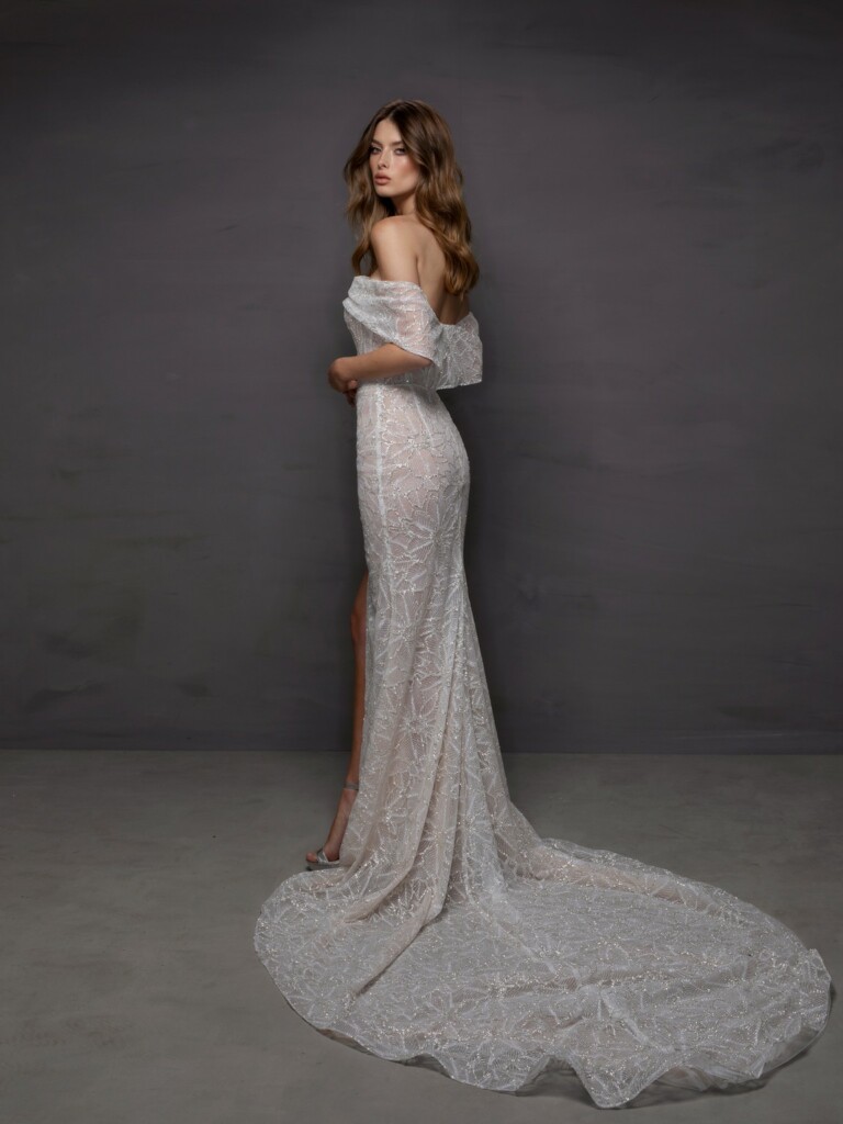 Unde mai mergem când ne dorim ceva de tipul „clasic și contemporan”? New York! Această rochie moale este confecționată din dantelă strălucitoare, cu trenă de teaca, o fante înaltă și un decolteu portret fabulos. Tot ceea ce speră o mireasă îndrăzneață poate fi găsit în New York!