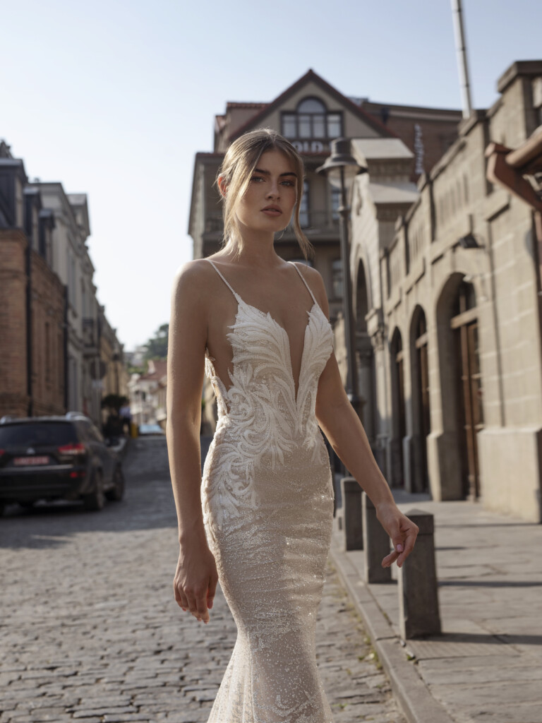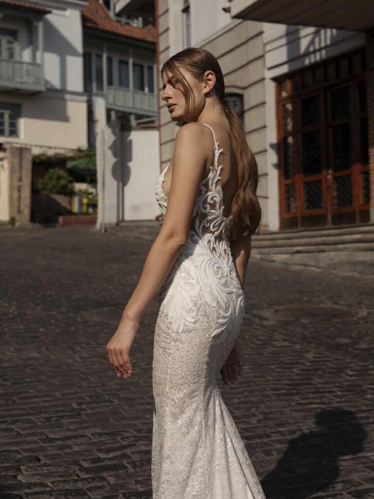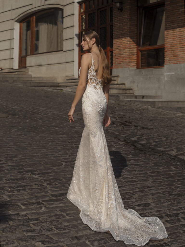 Pentru un stil remarcabil, o rochie de mireasă uimitoare cu trenă, cu decolteu în V adânc, spate deschis, bretele spaghete compuse din dantelă orbitoare și ornamente subtile de margele de-a lungul vârfului. Silueta sa măgulitoare, feminină, sufocantă și elegantă arată uimitor pentru oricine. Privește cum furi spectacolul mergând pe culoar purtând această rochie.