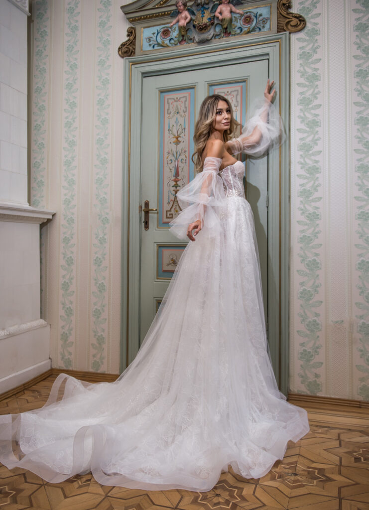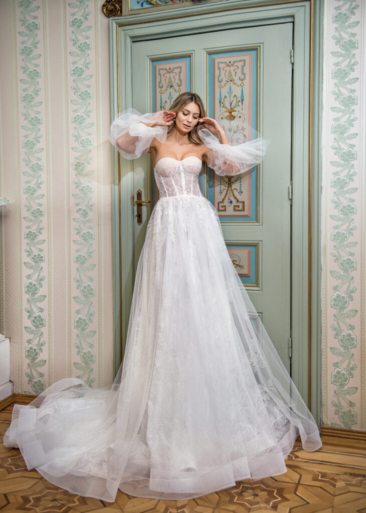 Vera Sposa » Rochii de mireasă » Colecția Couture » CLARICECLARICEROCHII DE MIREASăRochie de mireasa din tulle cu corset pe bust fara bretelute,dar avand manecute detasabile.Fusta are o usoara trena. COD PRODUS VS-0351-10824 » PROGRAMEAZA O VIZITA