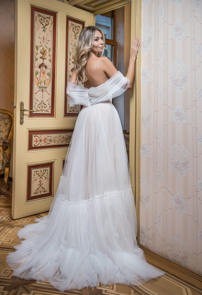 Vera Sposa » Rochii de mireasă » Colecția Couture » EVAEVAROCHII DE MIREASăRochie de mireasa stil A din tull moale cu buline , corset in forma de inima , bretele cazute si un volan in partea de jos . COD PRODUS VS-0351-10827 » PROGRAMEAZA O VIZITA